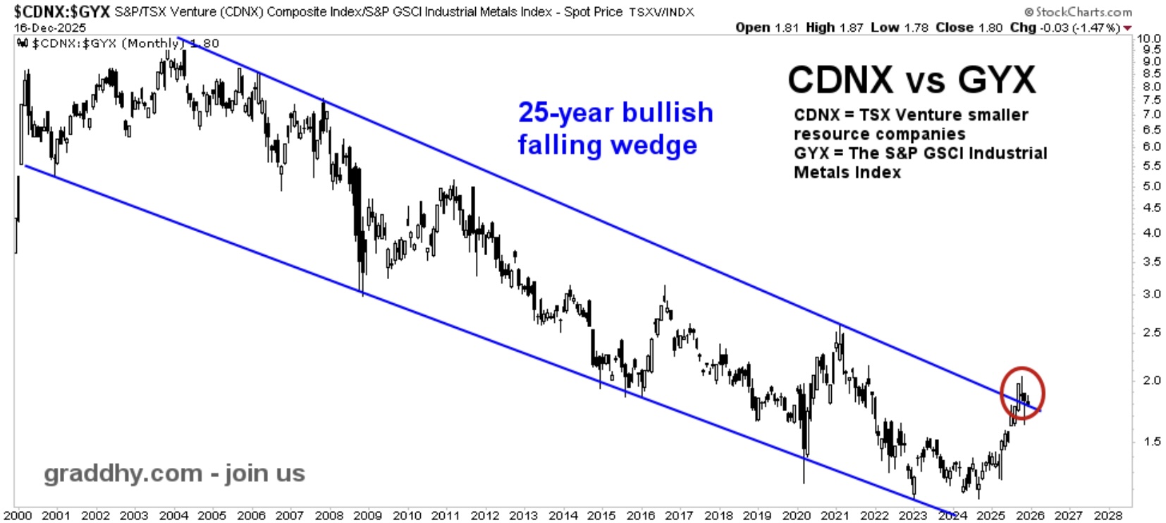 December 23 (King World News) – Graddhy out of Sweden: Smaller companies in the metals and mining sector are breaking out hugely vs industrial metals. Think, for example, COPX vs copper, LITP vs lithium, NIKL vs nickel etc. Miners outperforming the underlying metal is what makes a bull. So the 25-year (..!) breakout here is another brick in the commodities bull wall.
