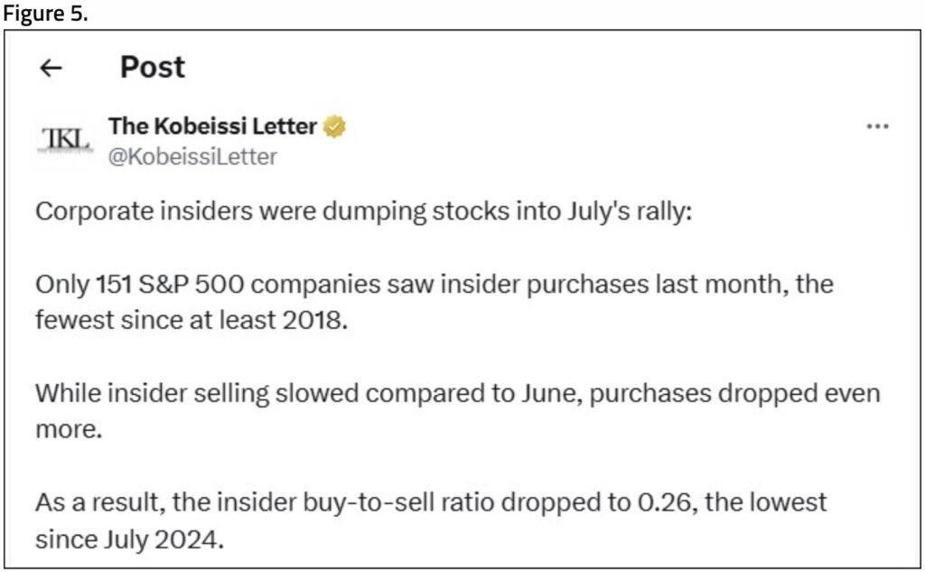 Additional grist for the bearish mill includes the recent preponderance of insider selling. The Kobeissi Letter (@KobeissiLetter) posted on X at 3:28 PM on Tuesday, Aug 05, 2025: