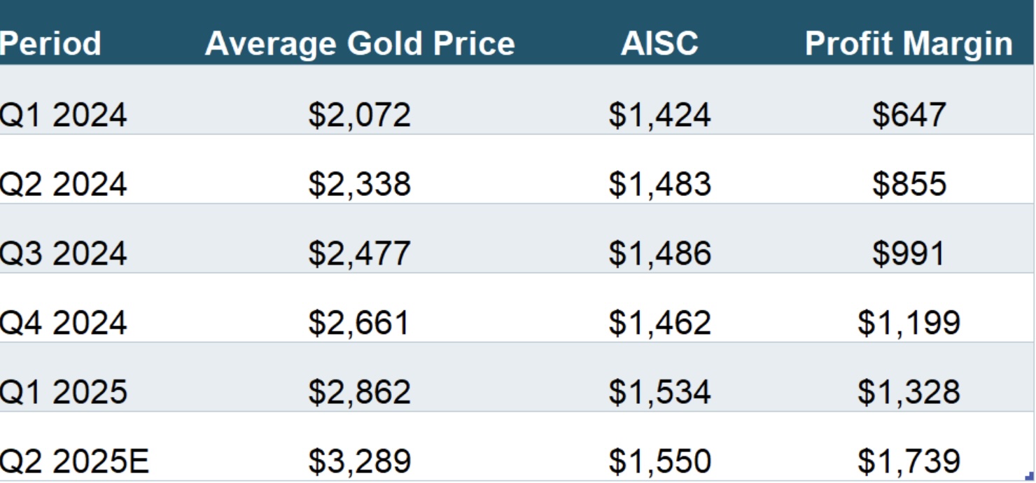 For gold miners, the approximate industry-wide profit margin has increased from $647 per ounce in Q1 2024 to approximately $1,700 in Q2 2025, a gain of 168%.
