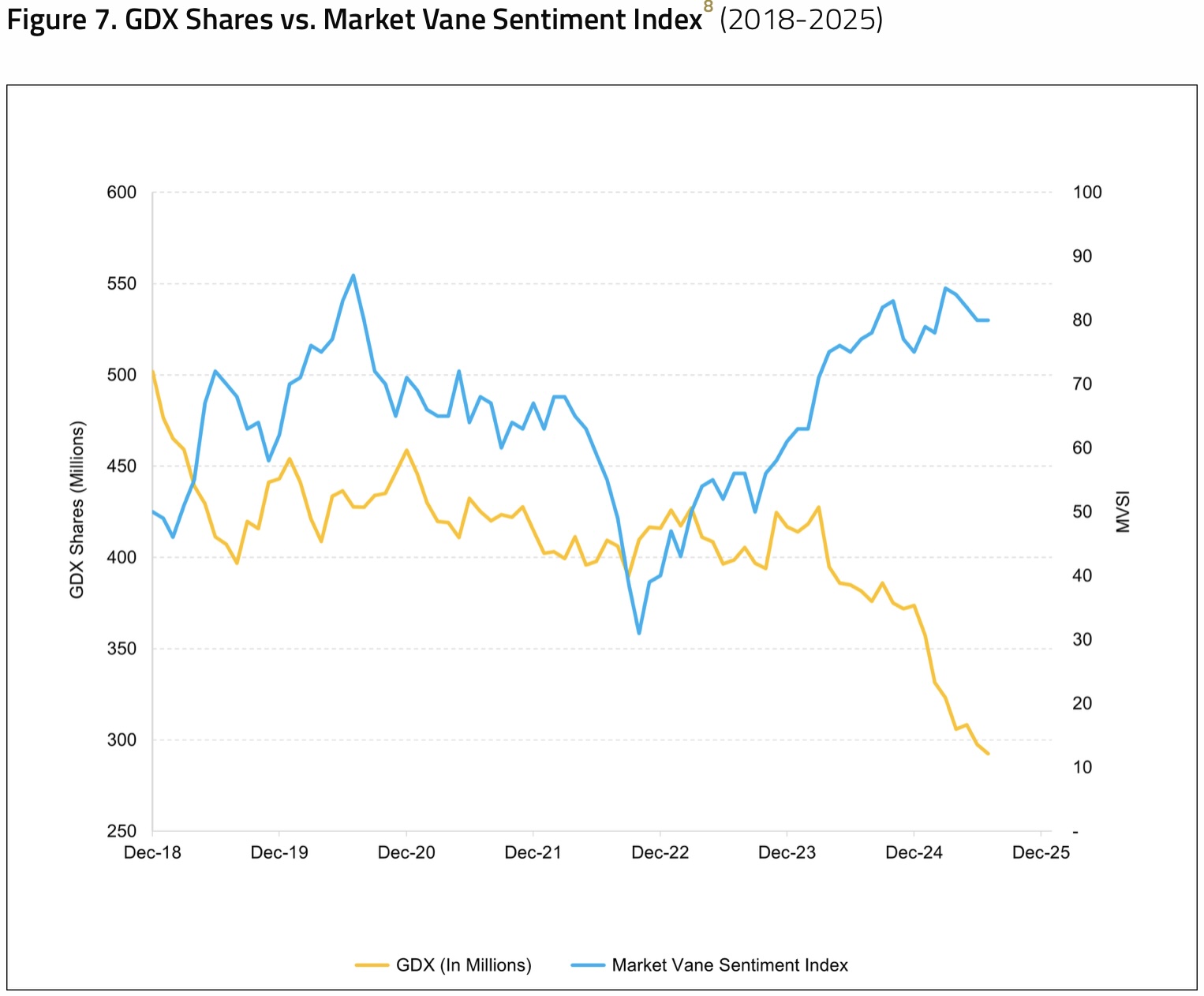 Is gold nonetheless a “crowded” trade? As reported by the June 2025 Bank of America (BofA) Global Fund Manager Survey, 41% of respondents think so. However, BofA also reported that investors had allocated just 3.5% of their portfolios to gold. Sentiment is bullish, as reflected by Market Vane (Figure 7), but below the “Tariff” peak of Q1 2025 and the COVID peak of 2019. The steady liquidation of GDX gold mining shares suggests investor aversion to gold exposure.