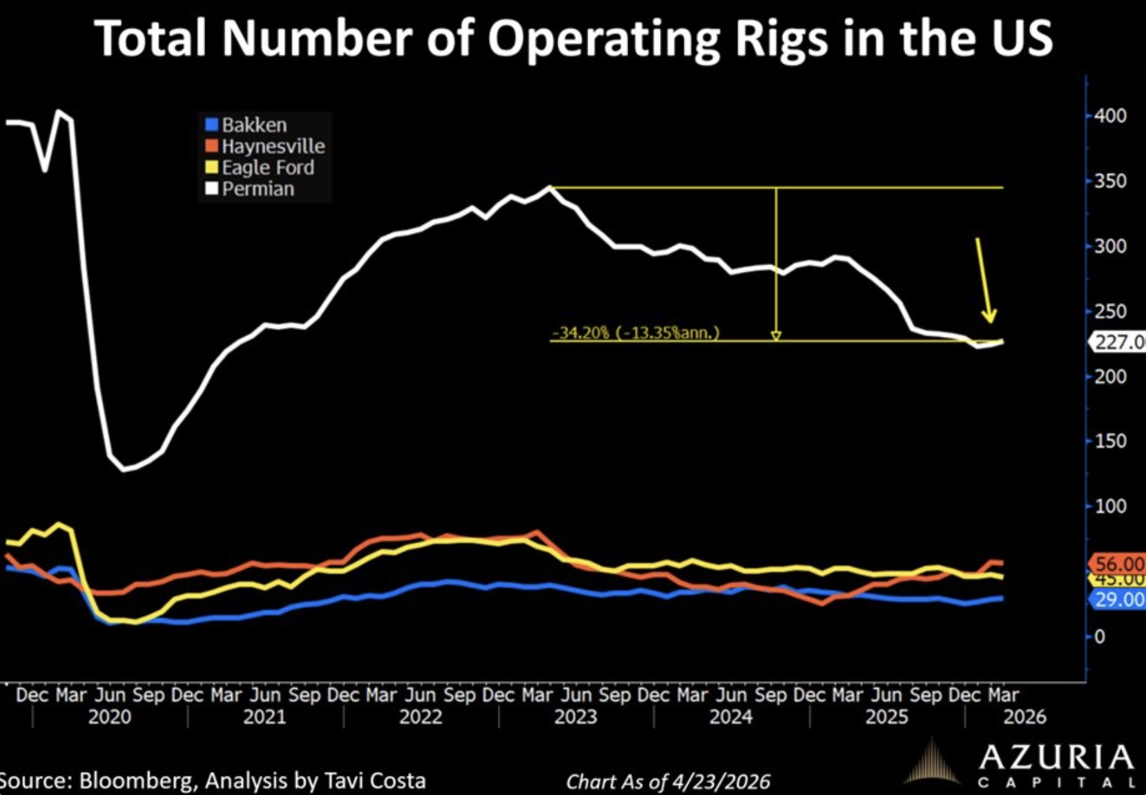 The number of operating rigs had already fallen by roughly 34% over the prior three years in the most critical US energy basin.