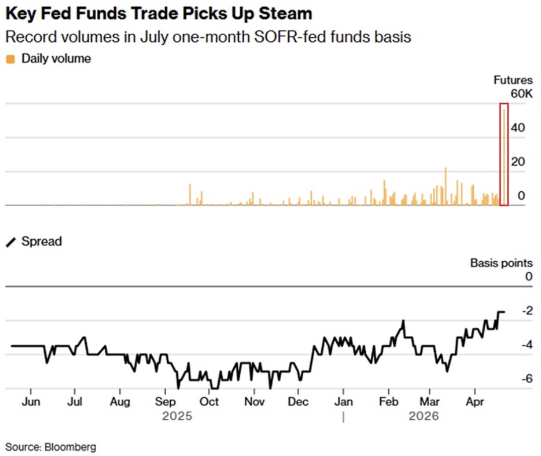 Daily trading volume in futures tied to the spread between the Secured Overnight Financing Rate (SOFR) and the Federal Funds Rate surged to a record 56,590 contracts on Tuesday.