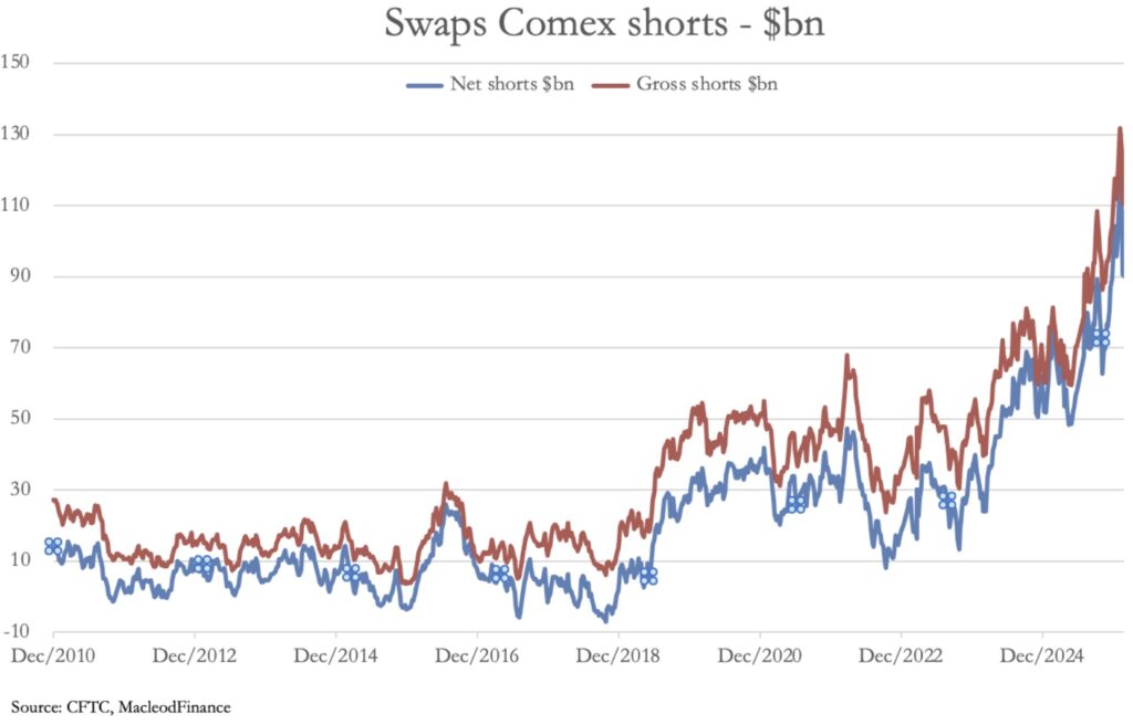 The falling settlement numbers in London from 44 million to 17 million, while the value of the settlement rose 4.5 times, illustrates the problem paper markets now face. On Comex, which has the same problem, this is demonstrated by the gross and net short position of the Swaps category, which is comprised mainly of bullion bank traders: