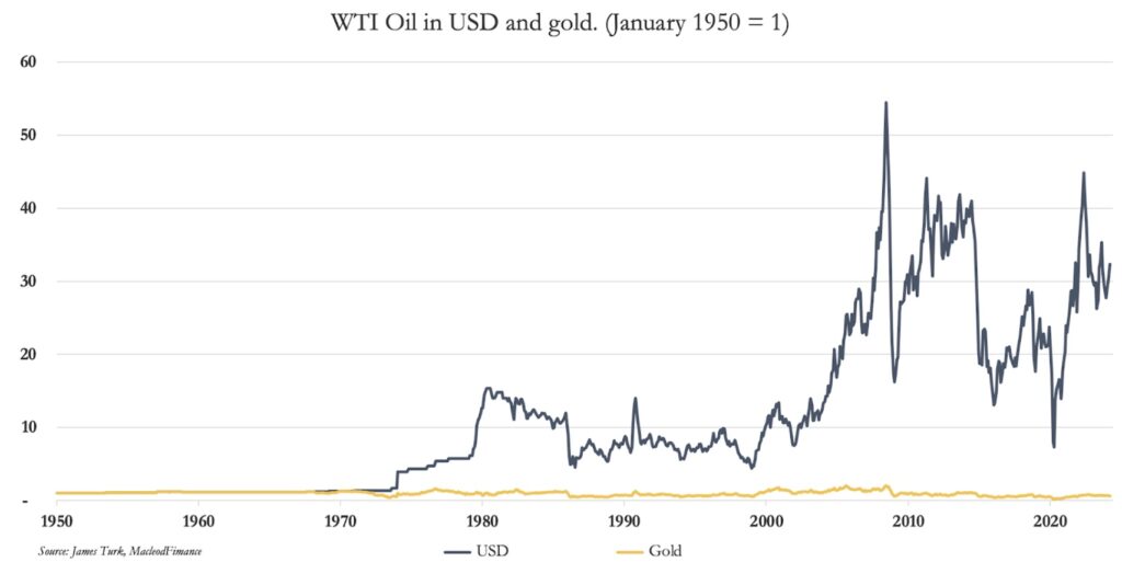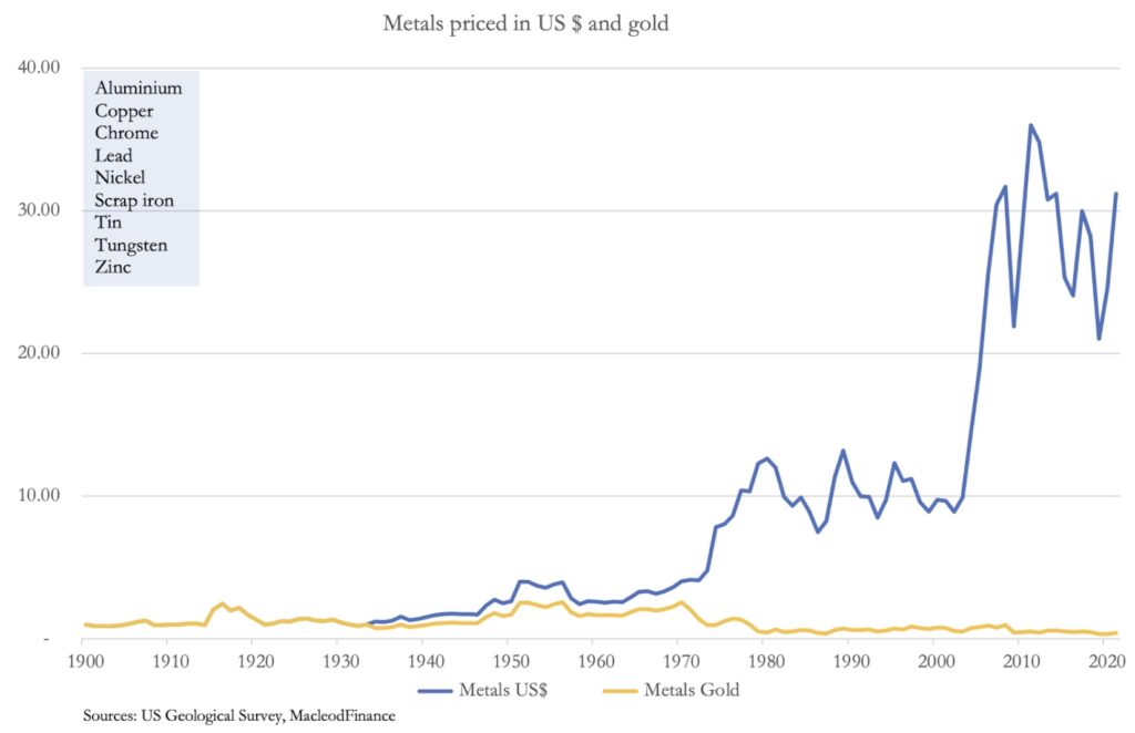 The relationship between dollars and gold has been a conundrum for many since the suspension of the Bretton Woods Agreement in 1971. The western financial establishment has lost all compass as to which is money and which is credit, with most actors not even aware of gold’s central importance. To illustrate this importance, the chart below shows average values for a range of industrial metals priced in dollars and gold, followed by a chart of oil similarly priced.