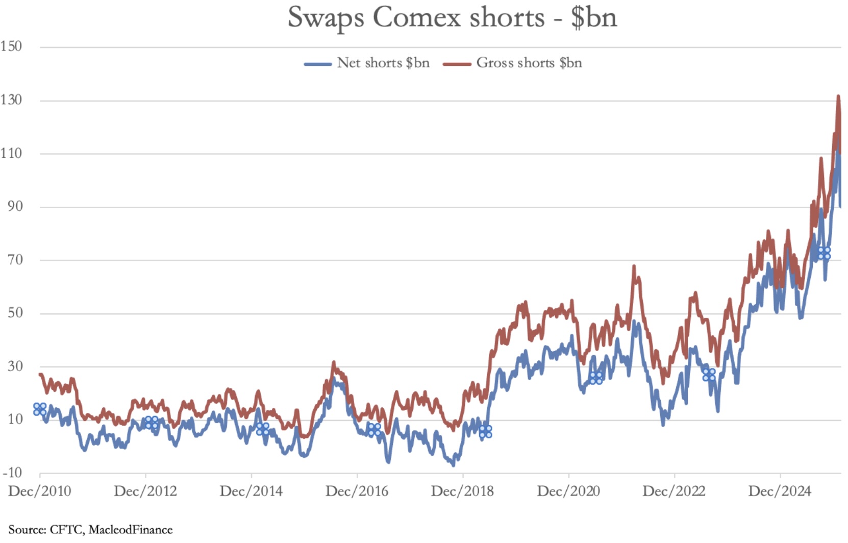 Between 2010 and 2018, the average gross short position was $15bn, compared with $112bn today. And the net position averaged $7bn, compared with $90bn currently.