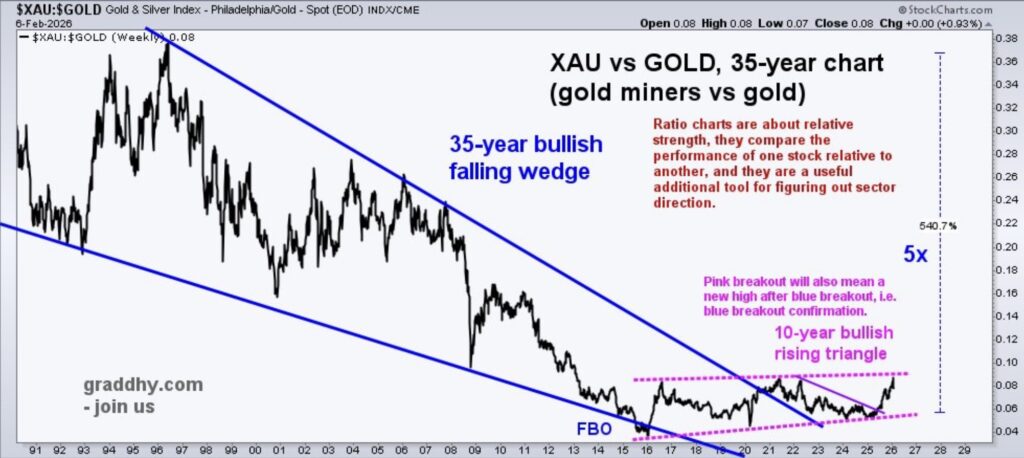 Graddhy out of Sweden: Been saying a pullback was getting closer and we are now getting it. But, do not lose sight of the very big picture. Gold miners are bottoming very big picture vs gold. Means gold miners will outperform gold long term, and that is when the main part of the bull starts.