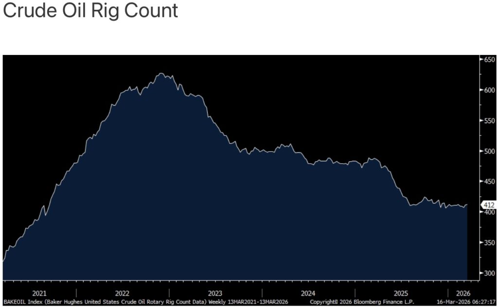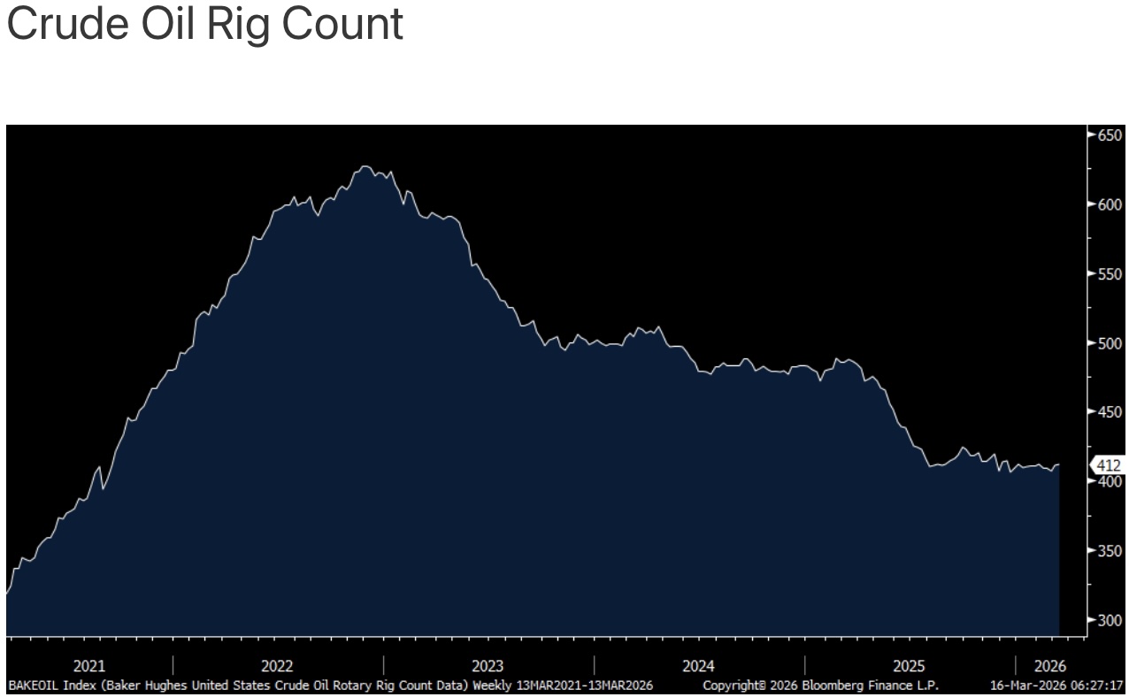At least through the lens of the US crude oil rig count, US drillers haven’t responded much yet to the spike in prices. For the week ended Friday, the rig count went up by just one rig to 412, still bouncing along the lowest level since September 2021.