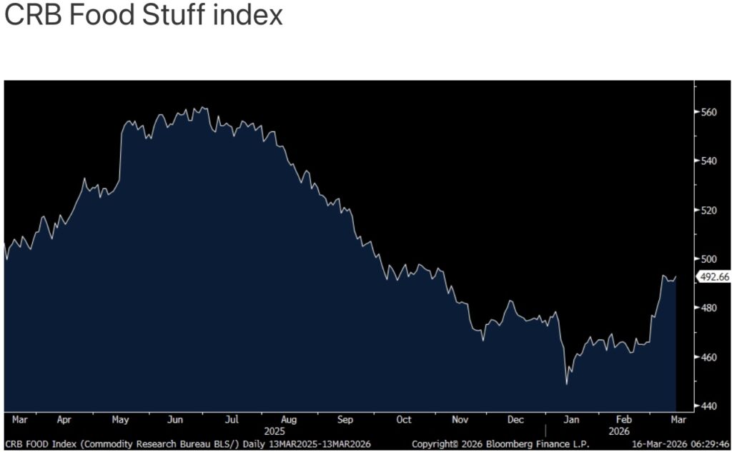 The CRB Food Stuff index closed Friday within pennies of the highest since last November.
