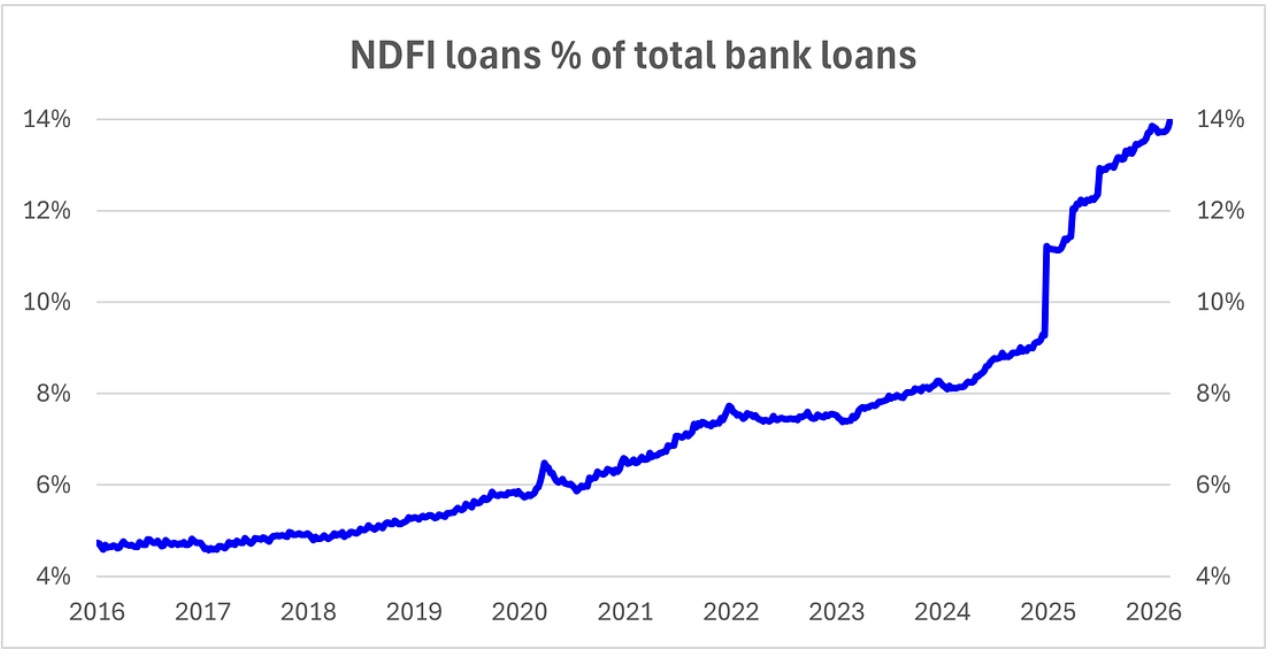 It was private credit that we know filled the void of bank lending post the GFC regulatory screws on the banks. It has been though banks that have been now lending to private credit and to what extent? This chart from my friend Adam Josephson. For those that aren’t watching closely, NDFI are non-depository financial institutions.