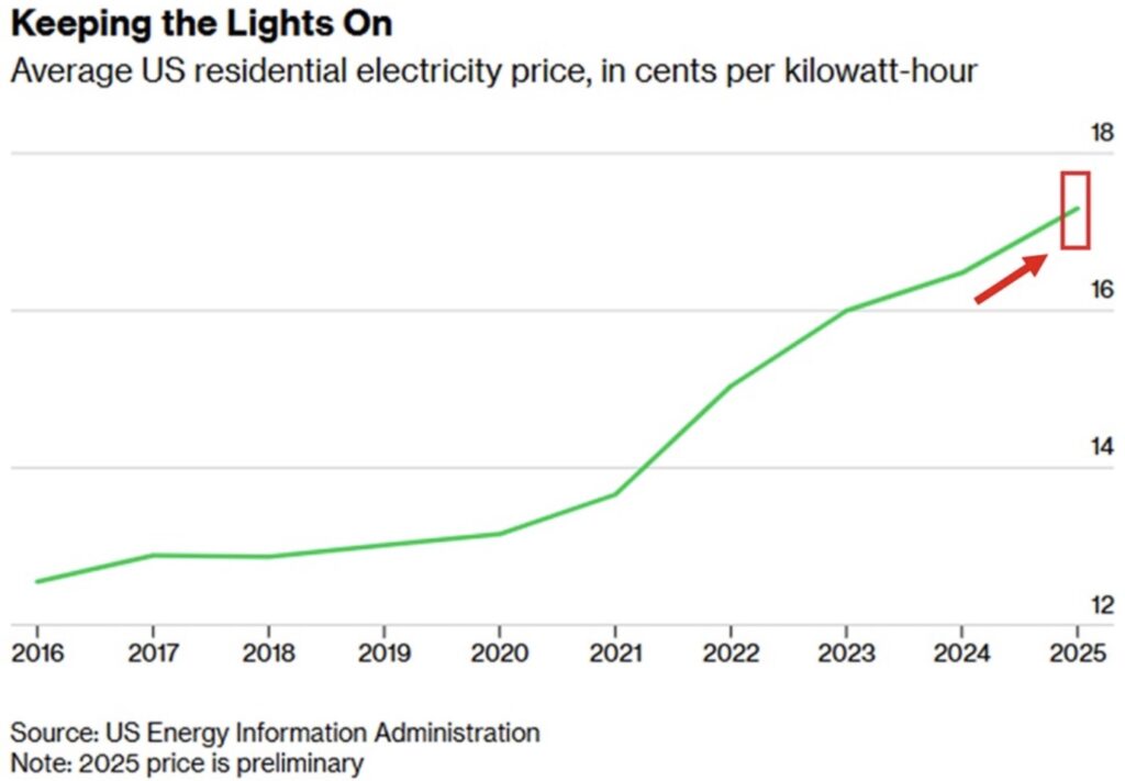 Average US residential electricity prices rose +5% YoY, to a record 17.3 cents per kilowatt-hour in 2025.