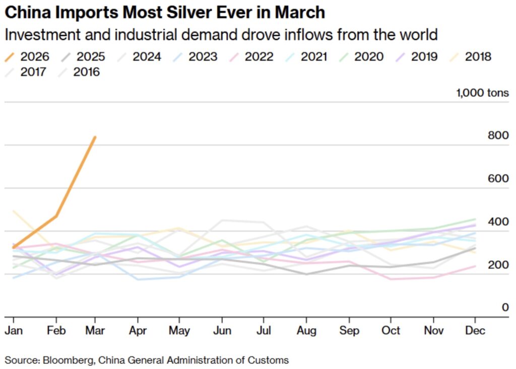 China’s silver imports surged to a record high in March, reaching around 836 tonnes, well above the 10-year seasonal average near 300 tonnes for the month. Strong demand from retail investors and the solar sector has kept domestic prices trading at an approximate 10% premium to London so far this year.