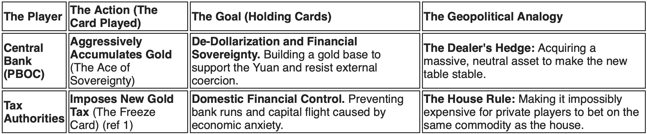 • Tariffs Fuel Panic: Tariffs cause global gold prices to surge. The government’s tax hike is a frantic domestic counter-measure to stop this flow and stabilize its banking system while it plays the long game against the West.