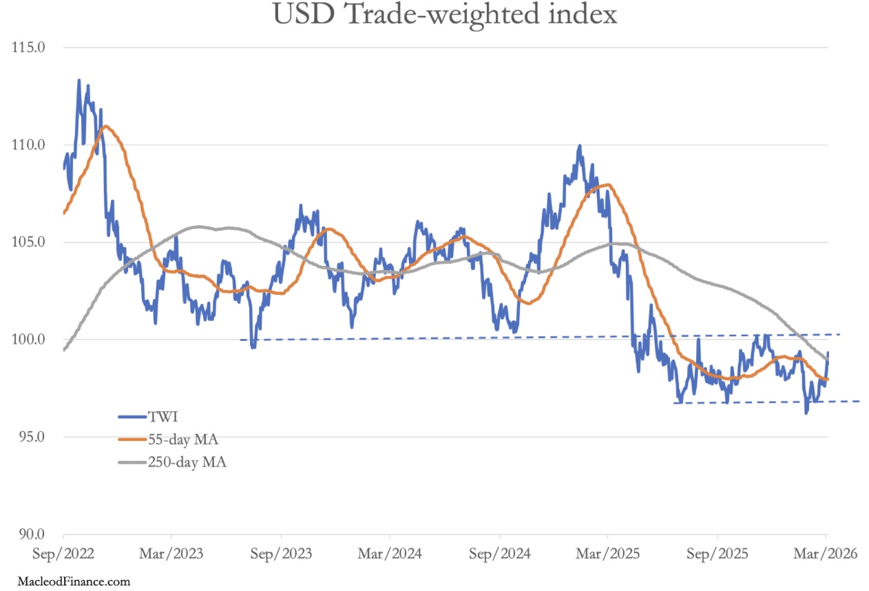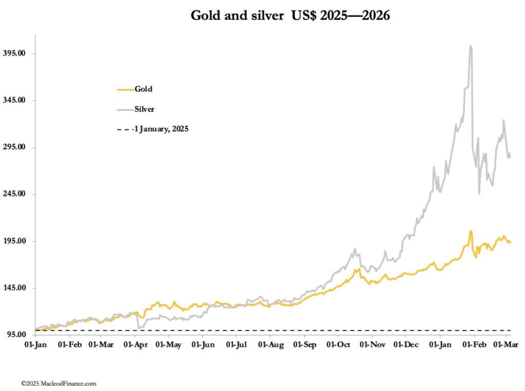 Last weekend, the US and Israel attacked Iran and the week’s news was dominated by another Middle East war. Markets’ gut reaction was to mark down investment assets and mark up dollars. Consequently, in the confusion gold and silver declined on the week as the dollar rallied. In European trade this morning gold was $5090, down $230 from last Friday’s close, and silver at $82.70 was down $11 over the same timescale. Turnover on Comex in both contracts remained very low.