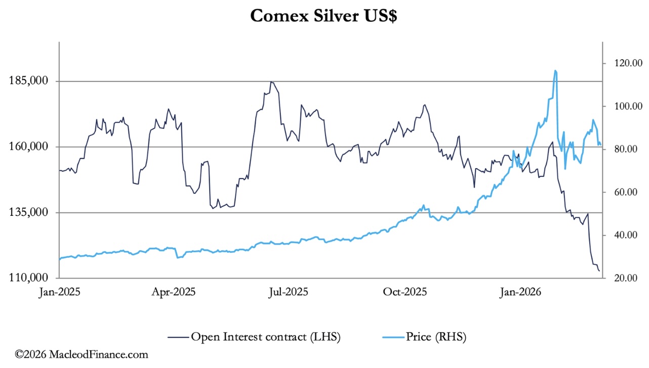 To summarise the position, paper silver in all markets is being encashed for physical, despite the fall in prices since 29th January when silver peaked at over $120. And with China being more of a physical delivery market, Comex and London paper contracts are declining into irrelevance.