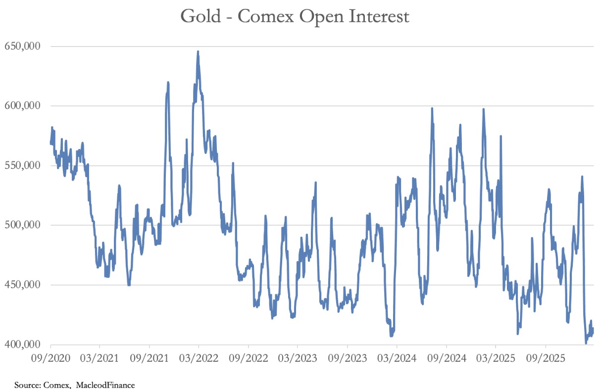 As with silver, there is minimal speculative interest in gold, with Comex’s open interest at the lowest levels since the covid pandemic: