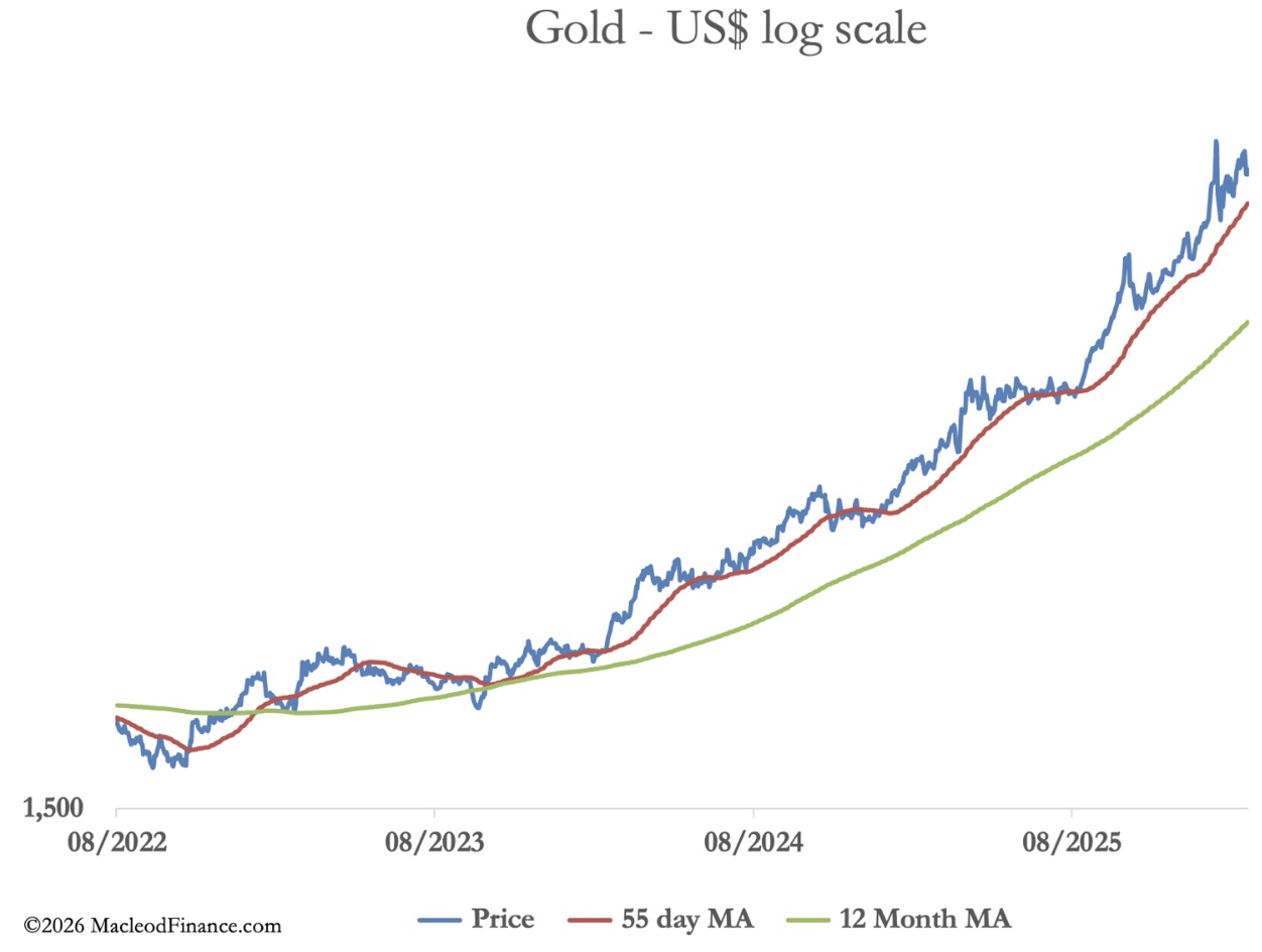 The logarithmic chart demonstrates the underlying strength of gold’s uptrend despite short-term dollar demand: