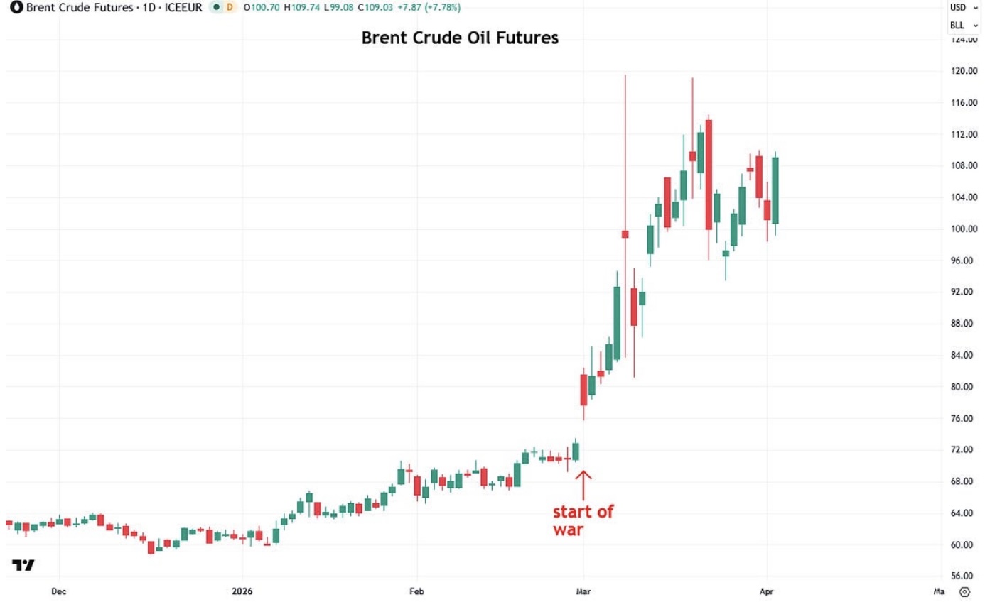 To start, let’s take a look at the chart of Brent crude oil, the international benchmark for crude oil. Since the start of the war on Iran a month ago, Brent crude has surged by approximately $37 per barrel, or 51%, and is now approximately $109 per barrel.