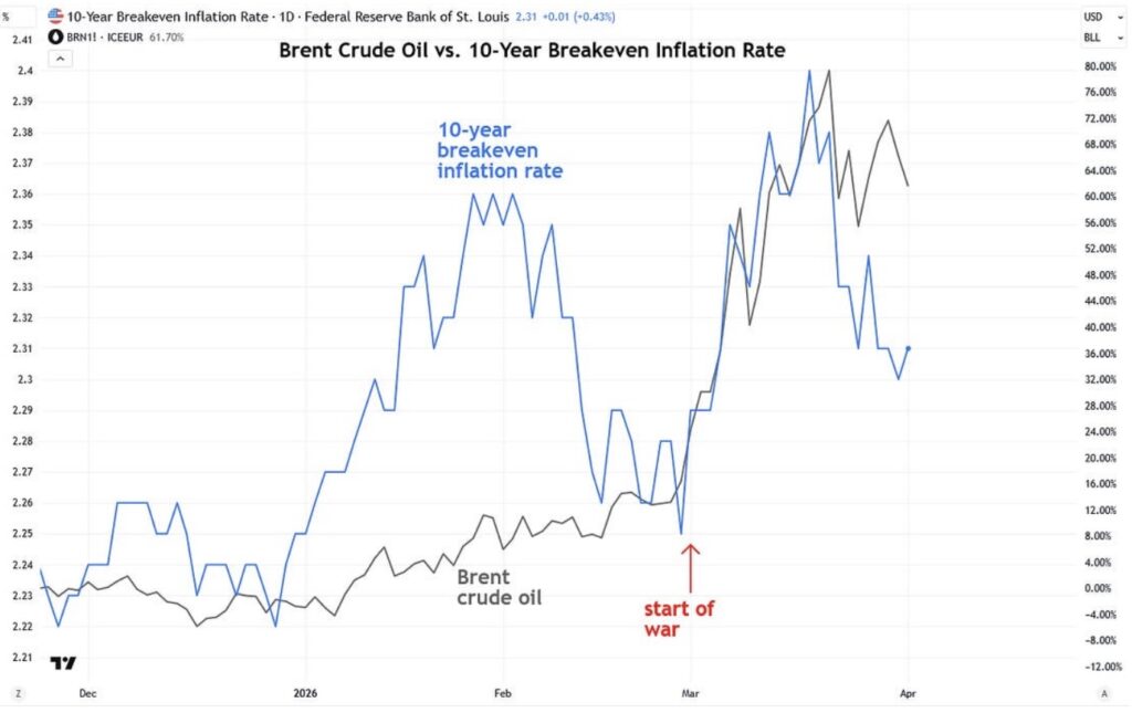 The surge in oil prices over the past month has driven inflation expectations higher, as measured by the 10-year breakeven inflation rate, a widely referenced indicator of expected inflation. It is calculated as the difference in yields between 10-year nominal Treasury bonds and 10-year Treasury Inflation-Protected Securities (TIPS), reflecting the market’s expected average annual inflation rate over the next decade.