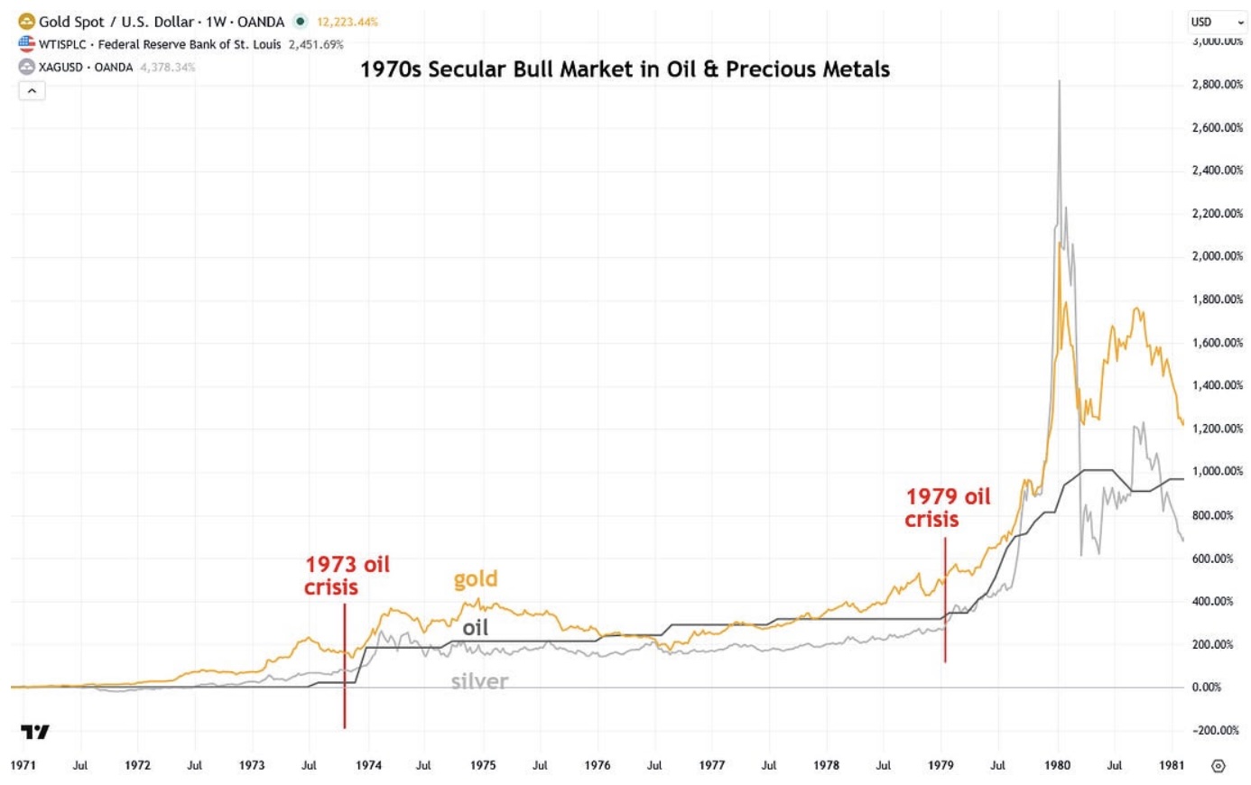 So now you understand the relationship between crude oil and precious metals, at least during the initial shock phase of the Iran war. Next, I want to show that historically, however, major surges in crude oil that unfold over extended periods, known as secular bull markets, have coincided with history’s most powerful secular bull markets in precious metals, namely the 1970s and the 2000s. Yes, I am aware that this flies in the face of recent price action since the war began, which is precisely why it is important to be aware of.
