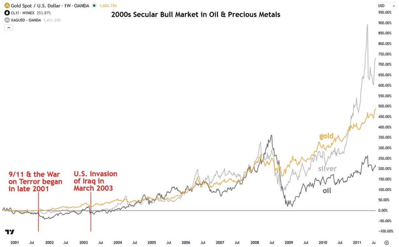 In this report, however, I want to show that this “oil up, precious metals down” behavior is likely limited to the initial shock phase of the war, and that historically, secular bull markets in oil, meaning long term advances that unfold over roughly a decade, have coincided with secular bull markets in precious metals, as seen in the 1970s and the 2000s.