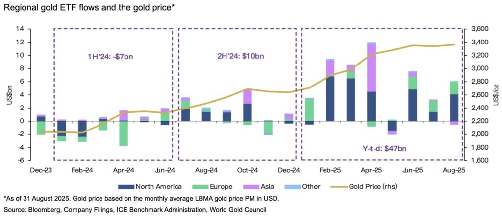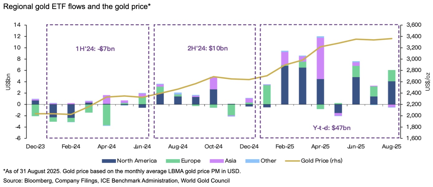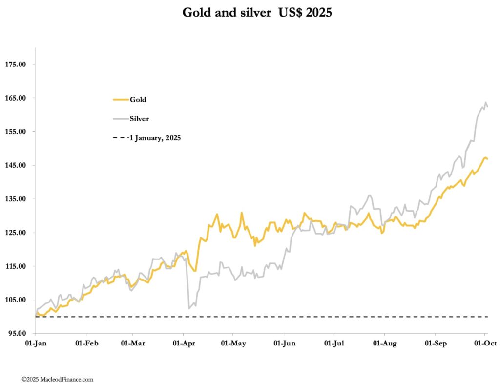 As our headline chart illustrates, gold and particularly silver have had a good week with prices continuing to rise. In European trade this morning, gold was $3860, up $101 from last Friday’s close. And silver at $47.33 was up $1.30 on the week. So far this year, gold is up 47% and silver by 63%.