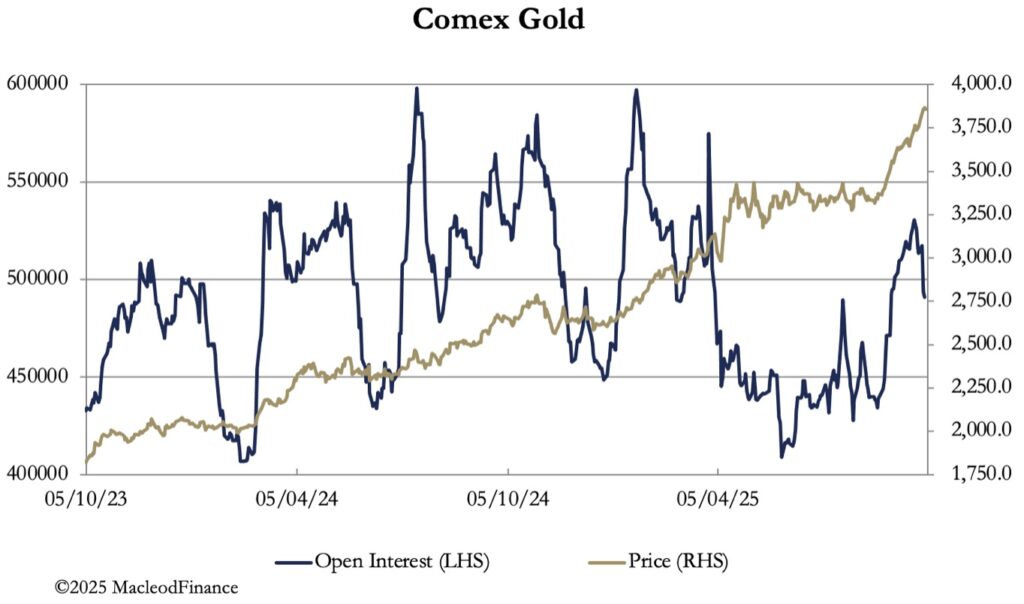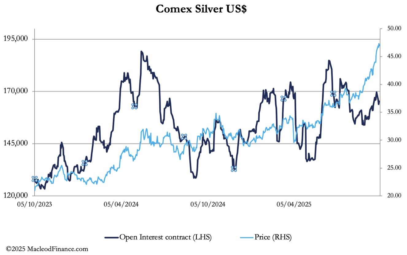The 63% rise in silver has been driven by a massive bear squeeze on Comex and not speculator interest, which has broadly moved sideways for the last eighteen months. In theory, bullion banks run short positions on Comex to hedge their longs on the LBMA. But backwardations and high lease rates in London tell us that this is not so: the bear squeeze is on London as well. And while the shorts appear to be holding their ground by containing open interest, the damage to them is from soaring prices.