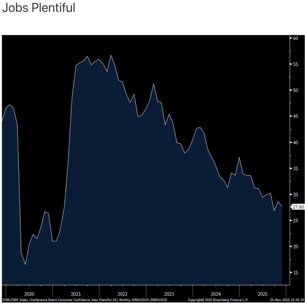 Not surprisingly, this is what continues to be the wet blanket on consumer confidence, “Consumers’ write in responses pertaining to factors affecting the economy continued to be led by references to prices and inflation, tariffs and trade, and politics, with increased mentions of the federal government shutdown. Mentions of the labor market eased somewhat but still stood out among all other frequent themes not already cited.”