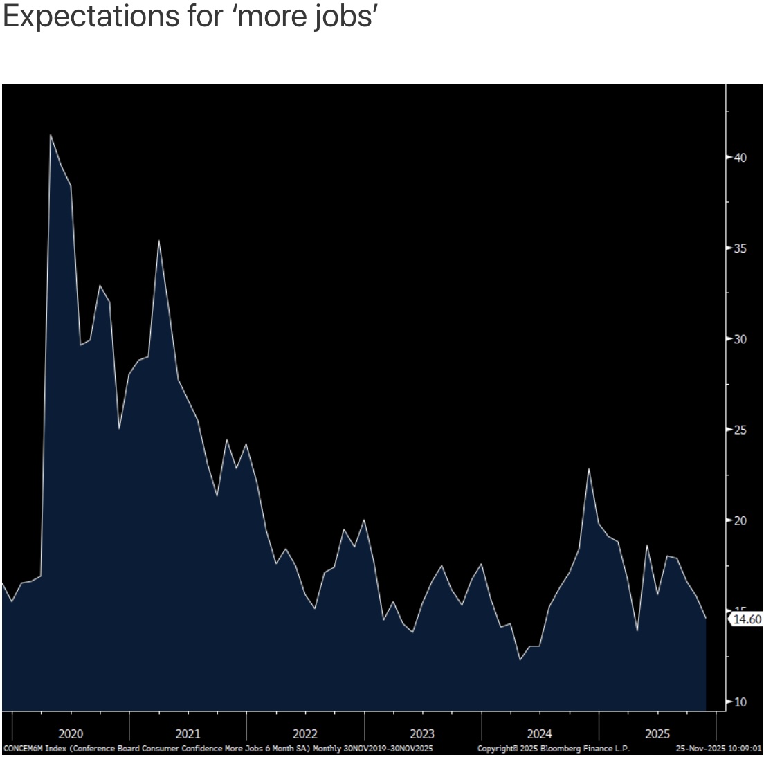 Not surprisingly, this is what continues to be the wet blanket on consumer confidence, “Consumers’ write in responses pertaining to factors affecting the economy continued to be led by references to prices and inflation, tariffs and trade, and politics, with increased mentions of the federal government shutdown. Mentions of the labor market eased somewhat but still stood out among all other frequent themes not already cited.”