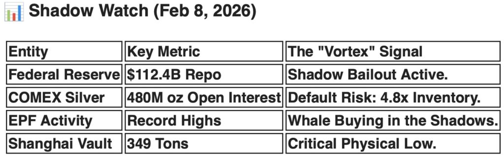 - The Shadow Bailout: On Friday, February 6, the Fed’s Standing Repo Facility (SRF) spiked to $112.4 Billion. This provided the “Big Four” (JPM, HSBC, etc.) with the emergency cash needed to handle the 480-million-ounce claim sitting on the March contract.