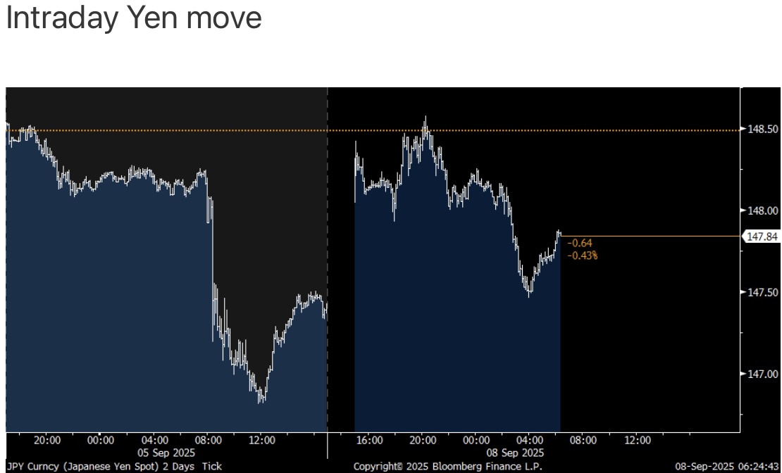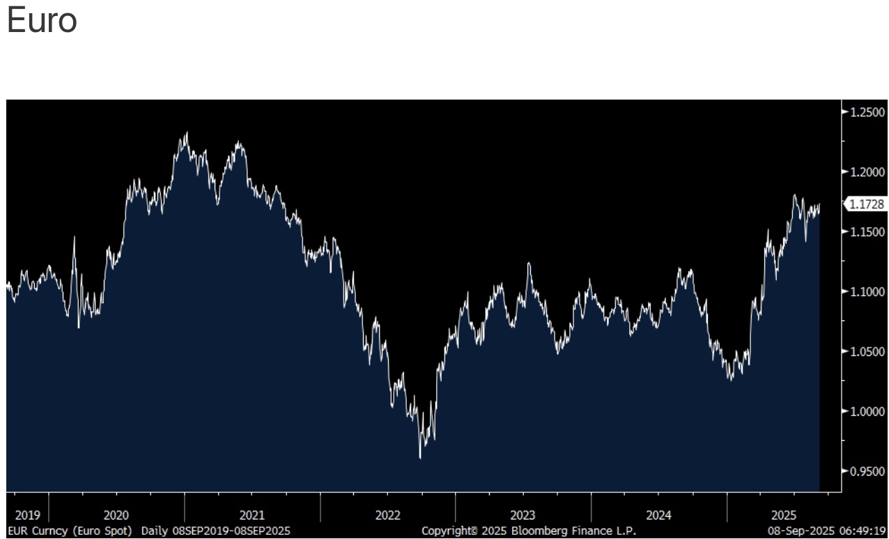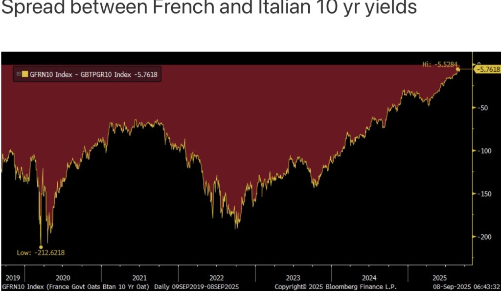 As we await the results of today’s French confidence vote (results likely out in the afternoon US est time) where Prime Minister Francois Bayrou will most likely lose his job, the French 10 yr Oat yield is down slightly by 1 bp at 3.43%. For perspective, that is only 6 bps below the Italian 10 yr yield and clear evidence of the change in fiscal focus of investors in European sovereign bonds. The euro is slightly higher vs the US dollar and with all the economic and French political challenges the EU is dealing with, the euro at just above $1.17 is at the highest level since late July and not far from the best level in 3 years.