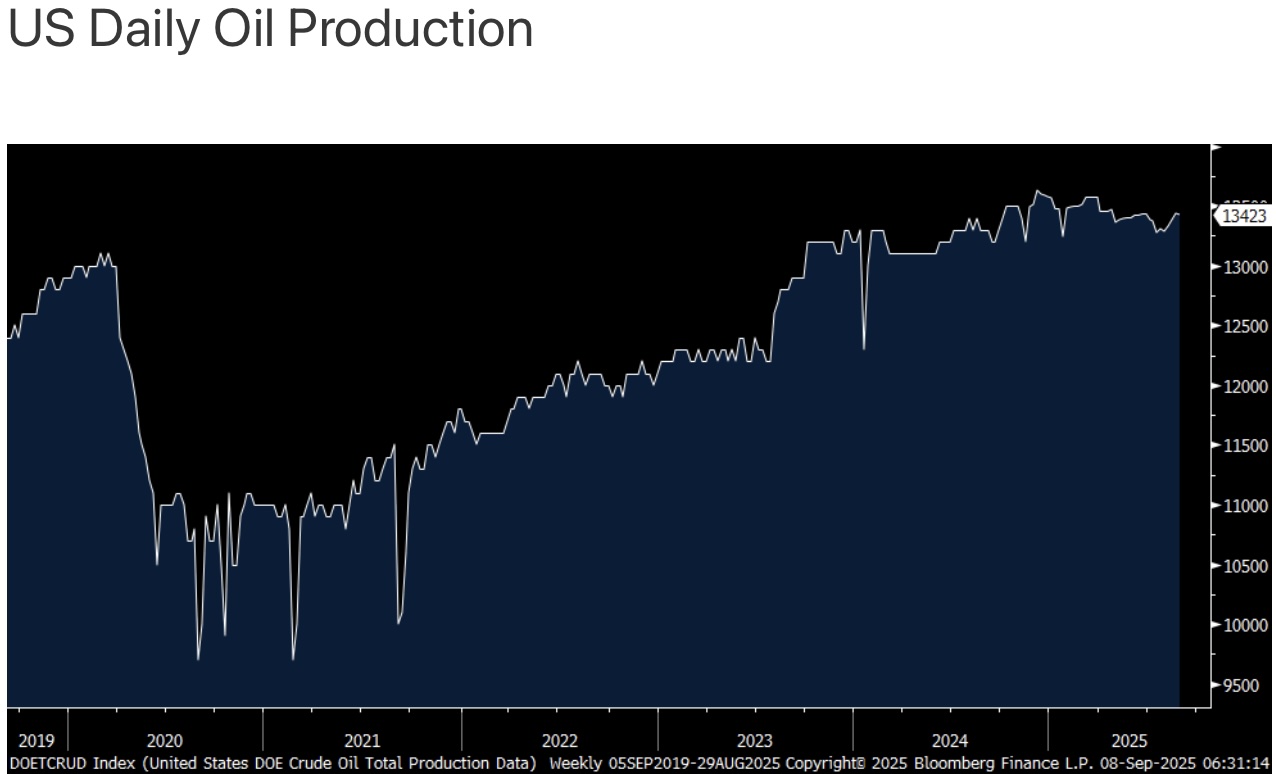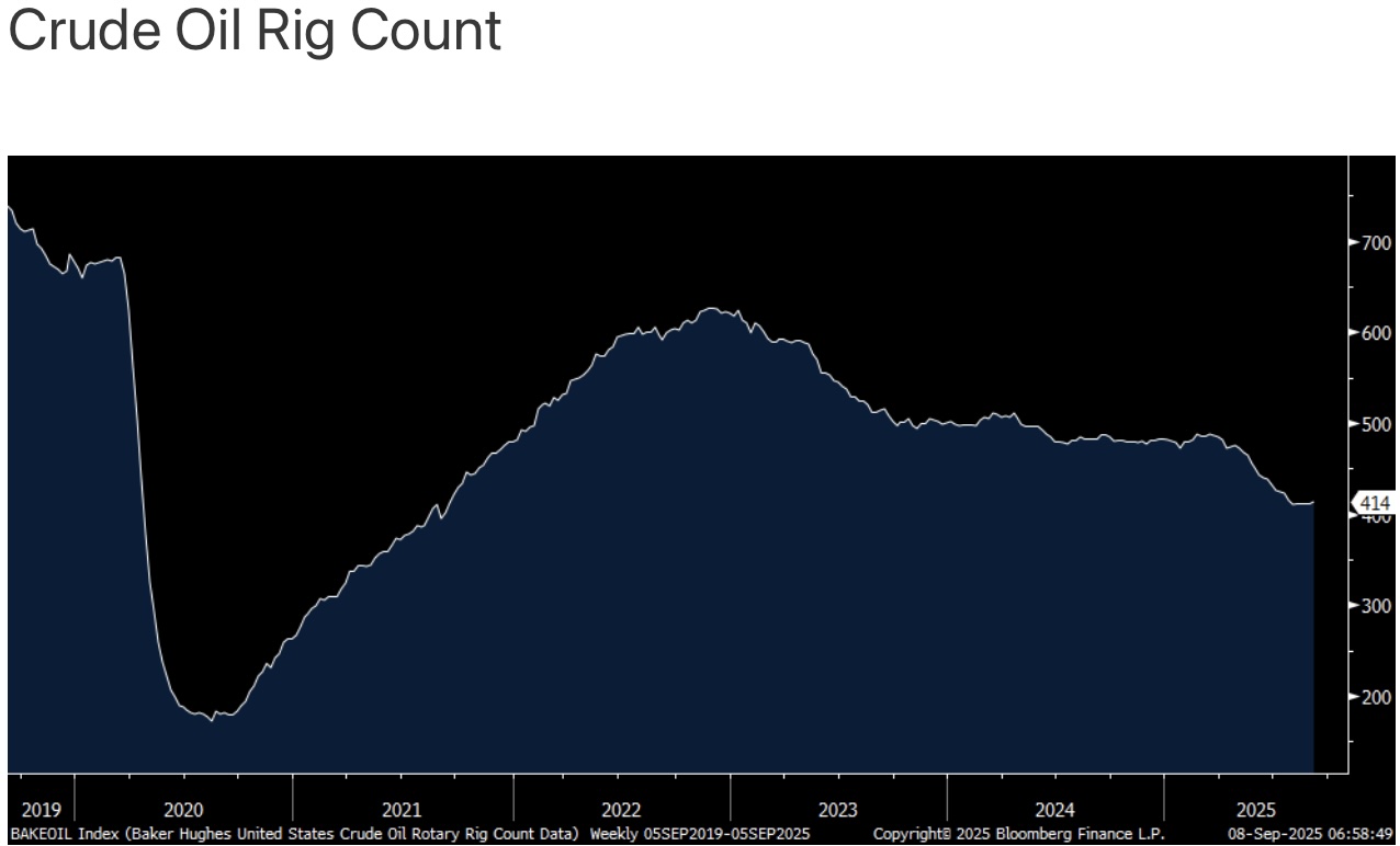 With regards to US production, the crude oil rig count did tick up by 2 rigs in the week ended 9/5 to 414, bouncing along the bottom, around 3 yr lows. And US oil production at 13.4 million barrels per day is not much different than it was a year ago and I expect it to actually fall next year if rig counts don’t increase. In the low $60’s I still believe crude oil is very cheap and we’re long oil and gas stocks.