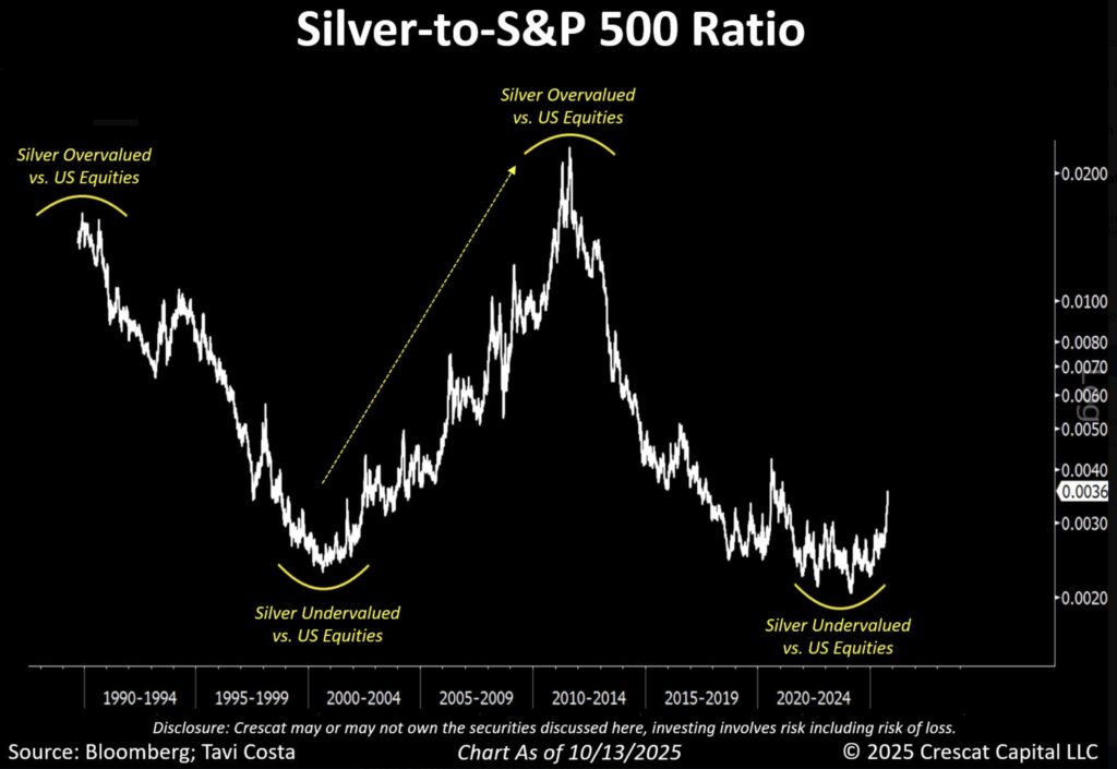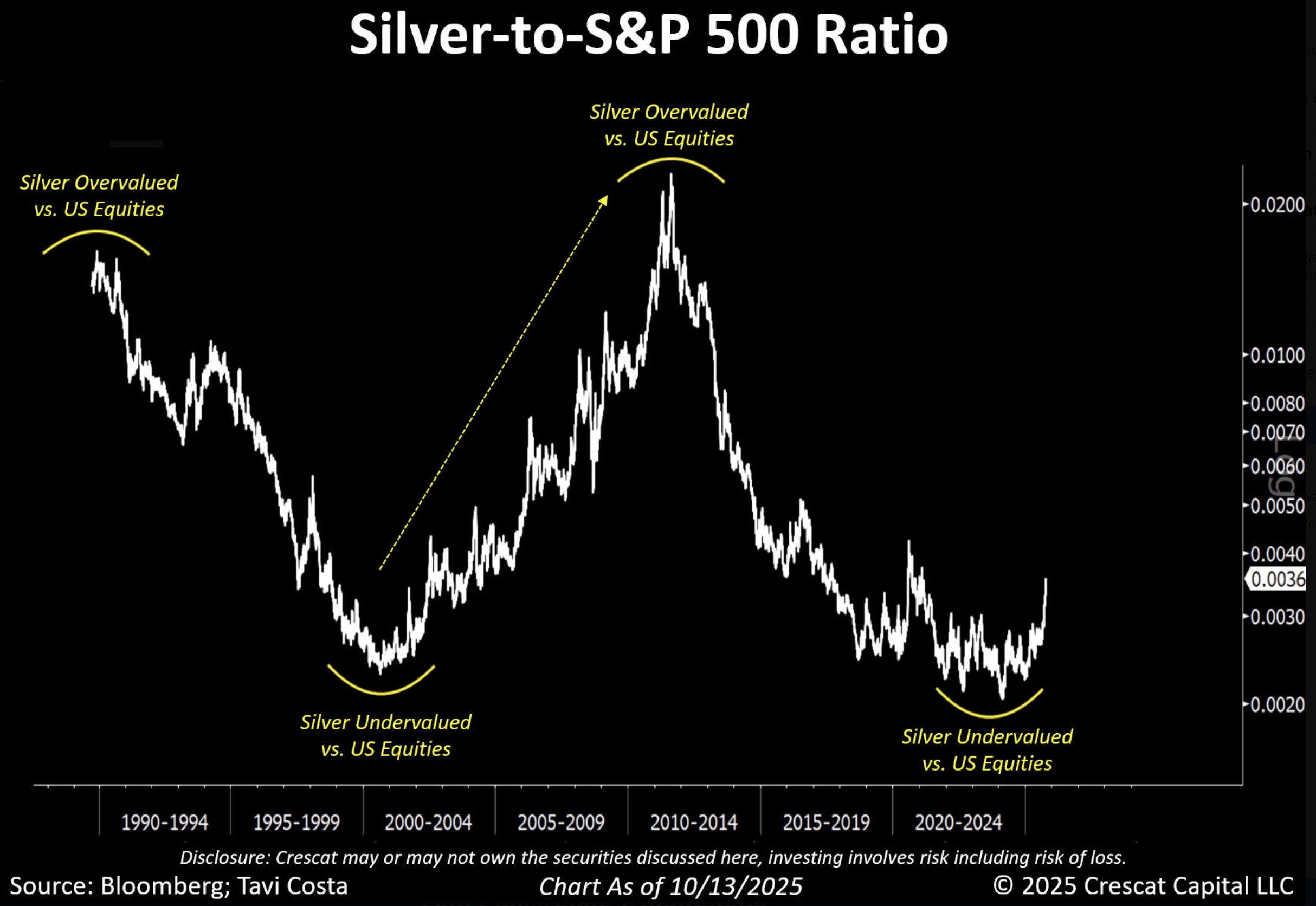 Otavio Costa: The updated Silver-to-S&P 500 ratio chart increasingly suggests the early stages of a major cycle where silver outperforms U.S. equities.