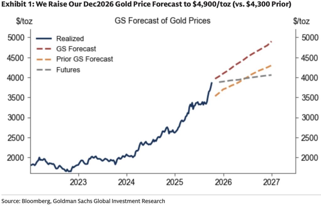 Holger Zschaepitz: Goldman Sachs has raised its December 2026 Gold price forecast to $4,900/oz (from $4,300 prev), citing strong & persistent inflows that have fueled a 17% rally since Aug26. The bank says continued buying from Western ETFs and Central Banks appears to be durable, prompting it to lift the base level of its pricing outlook.