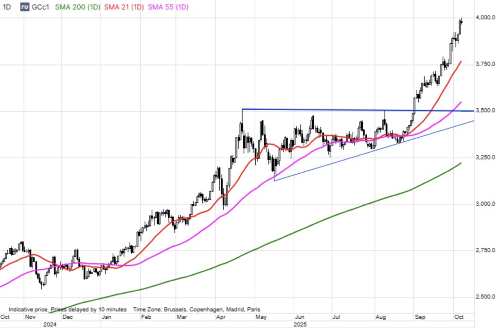 October 7 (King World News) – Old Hansen, Head of Commodity Strategy At Saxobank: COMEX gold futures kissed $4,000 earlier, with XAUUSD so far falling short, as some light profit-taking emerged amid a stronger dollar—especially against the euro, which is being dragged lower as the French political circus forces elevated EUR longs to reduce exposure. A deepening French crisis may inadvertently support gold allowing bullion and dollar to rally at the same time.