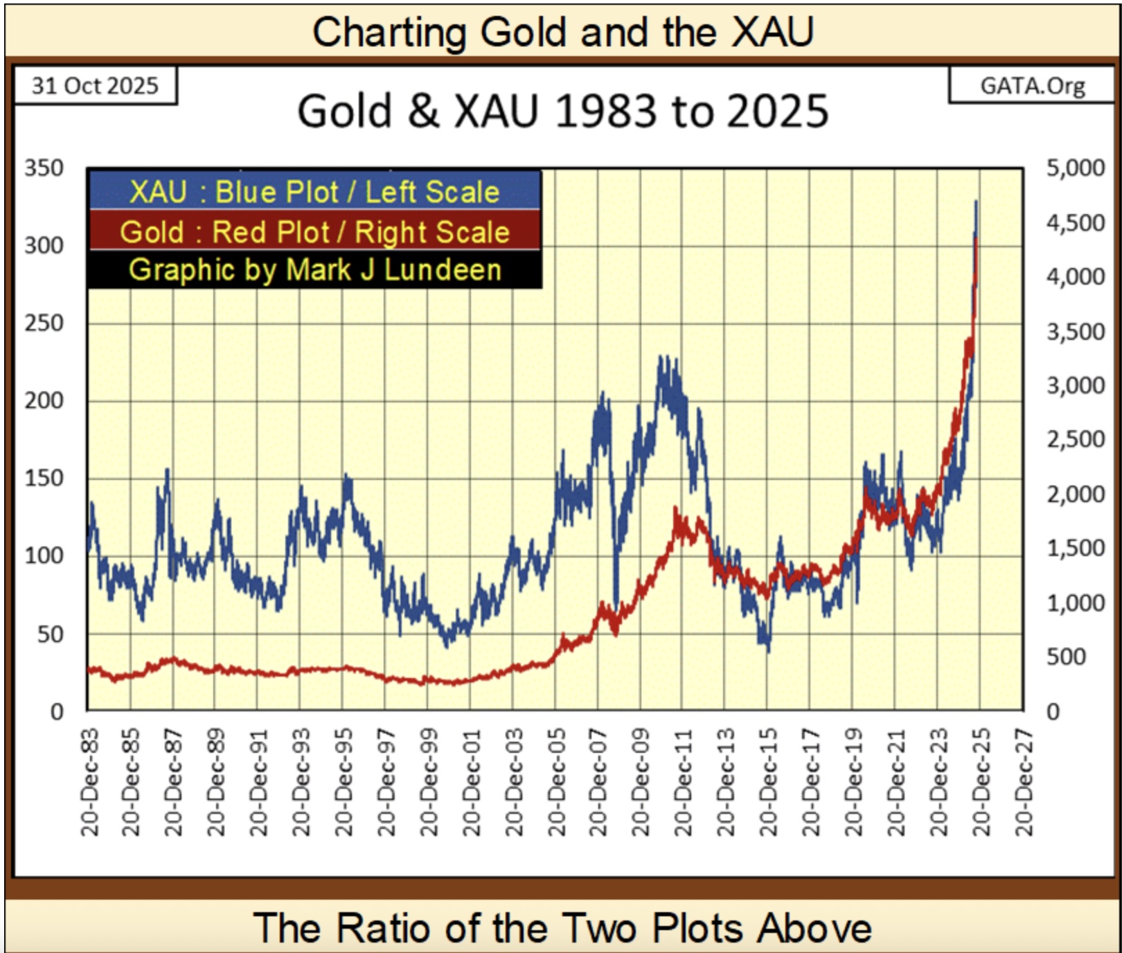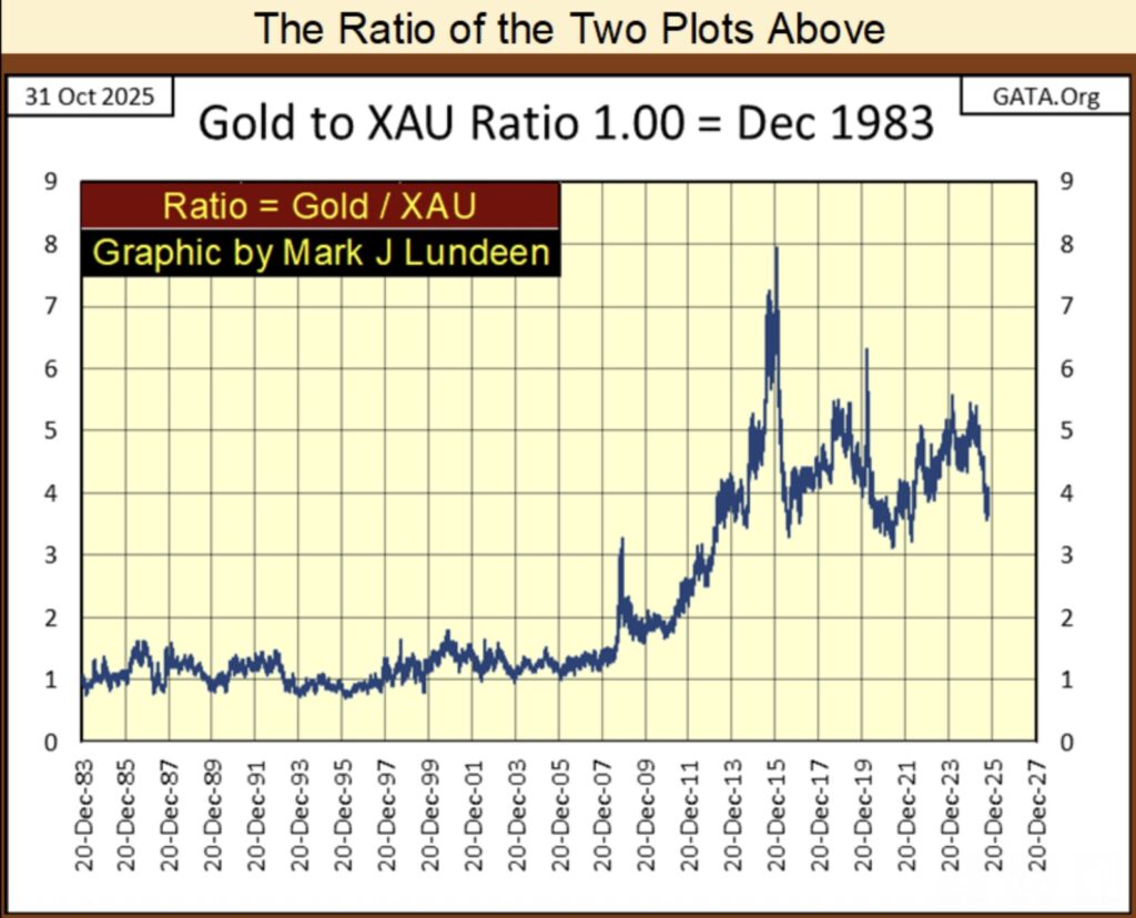 It’s after midnight, I’m tired, but it seems to me that the higher the ratio, the more undervalued is the XAU to the price of gold.  I might be wrong on that, but I don’t think so.