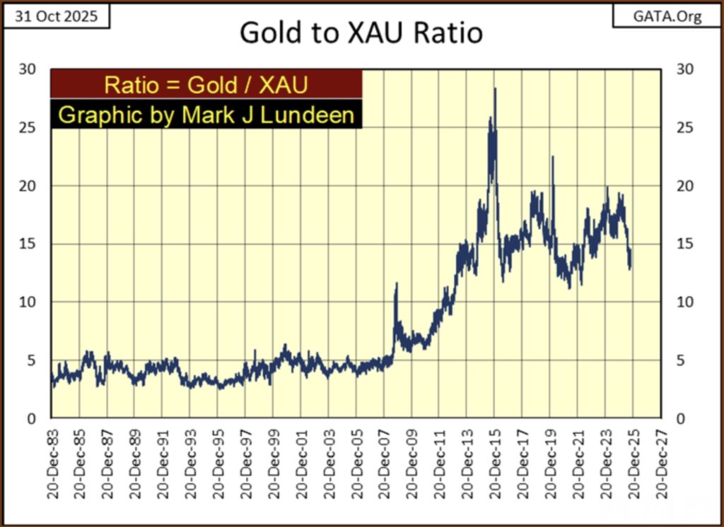 Again, the higher the ratio, the more undervalued the XAU is to gold.