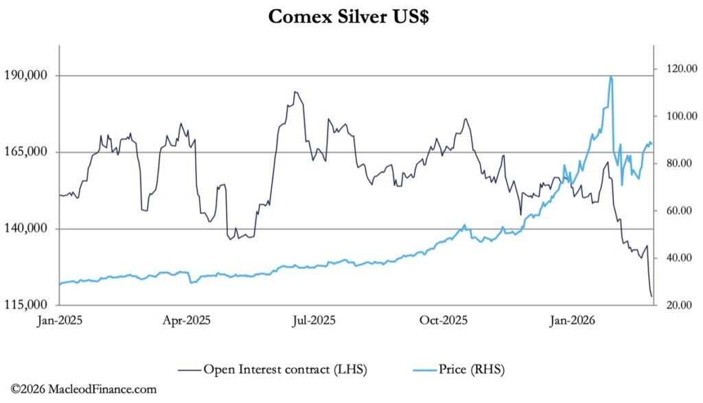 Silver is much more interesting. Comex open interest has collapsed which is explained by the short interest side effectively refusing to deal, other than to close existing positions. This is the next chart: