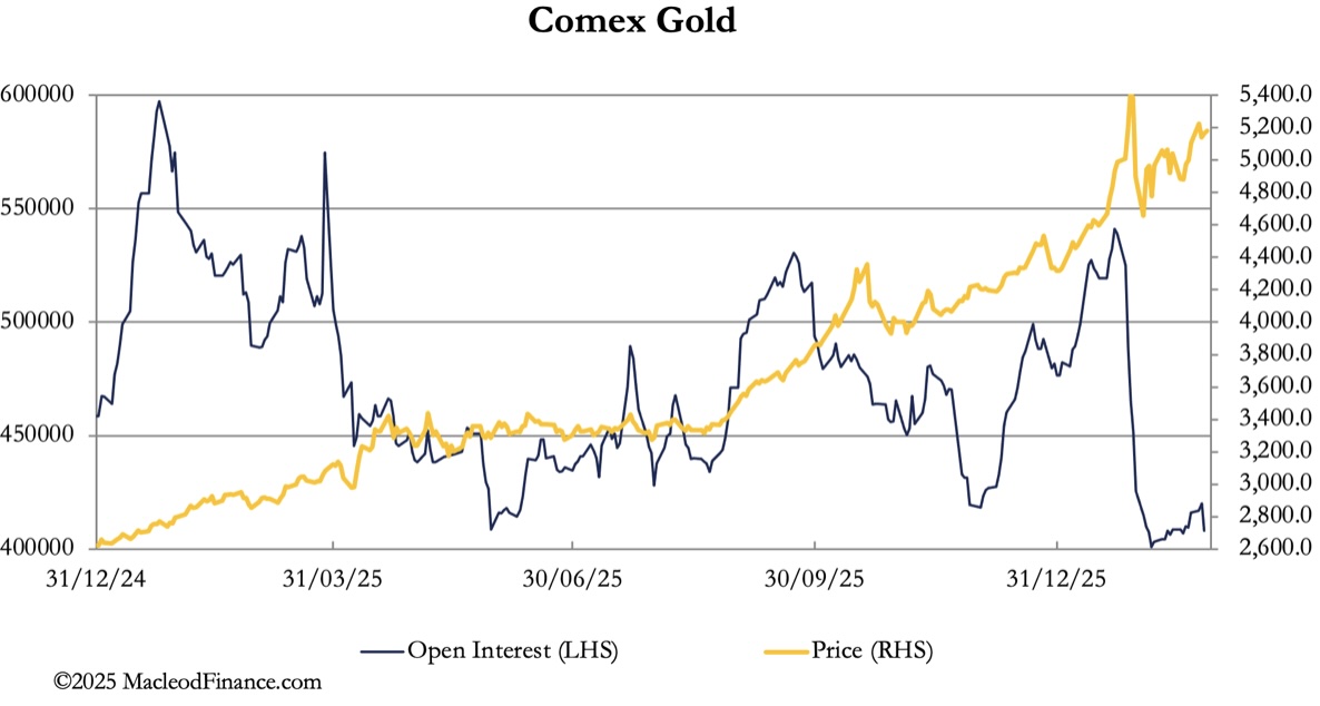 Silver is much more interesting. Comex open interest has collapsed which is explained by the short interest side effectively refusing to deal, other than to close existing positions. This is the next chart: