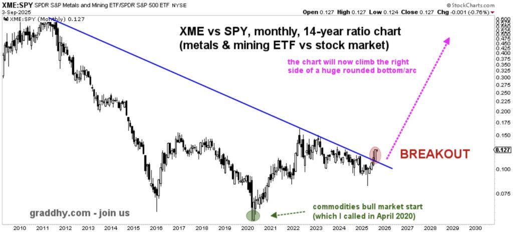 This means it is one more chart showing that the commodities bull market is entering a new phase: metals and mining sector is breaking out hugely vs stock market.