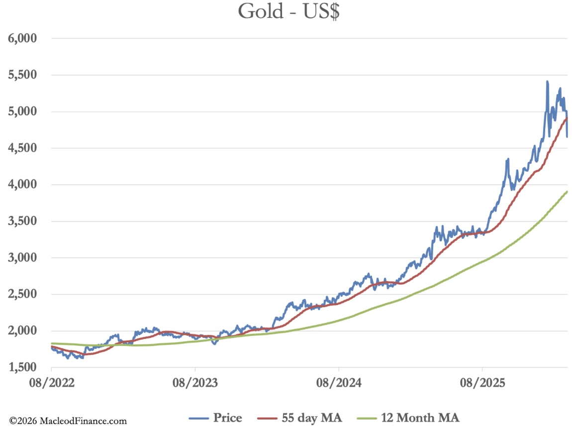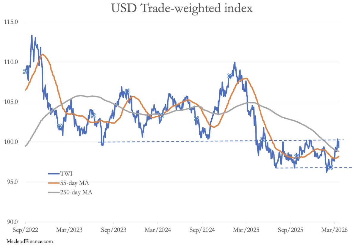 The chart below shows that gold could be described as consolidating nicely giving it a firm platform for its next leg up against the dollar. Meanwhile, the war in Iran is destabilising the world’s exporter of investment capital — Japan. The consequences are bound to speed up the collapse of bond and equity prices, and therefore the life of all fiat currencies. Despite its current volatility, physical gold remains the true safe haven.