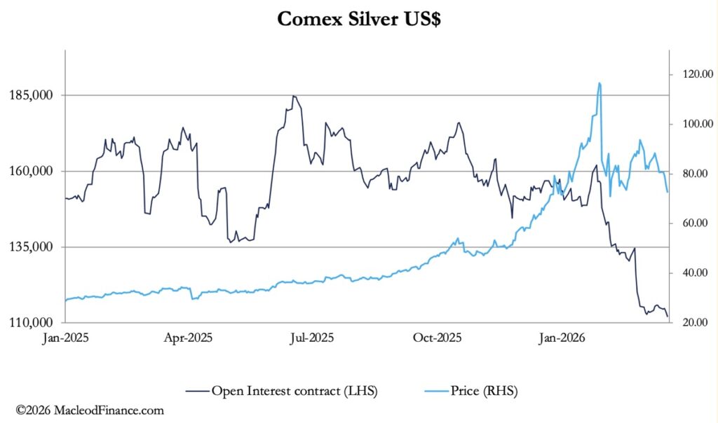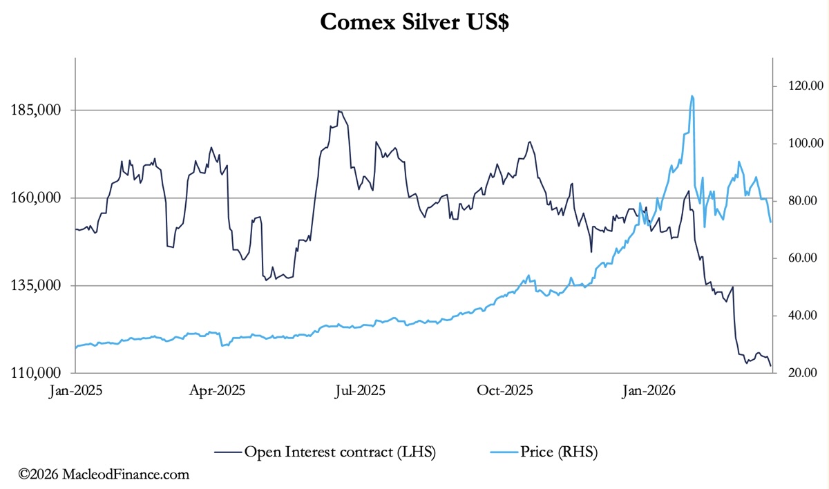 Whether bullion bank traders and market makers understand this is not an issue. They take each day as it comes, using every opportunity to level their books while trading profitably. When they perceive speculators are long and their buying pauses, they will mark down prices to take out long stops. And vice-versa for the shorts. However, the difference today is that speculators have minimal long positions to shake out. This is particularly noticeable in silver, where on this morning’s preliminary estimate Comex open interest is the lowest it has been for over 20 years:
