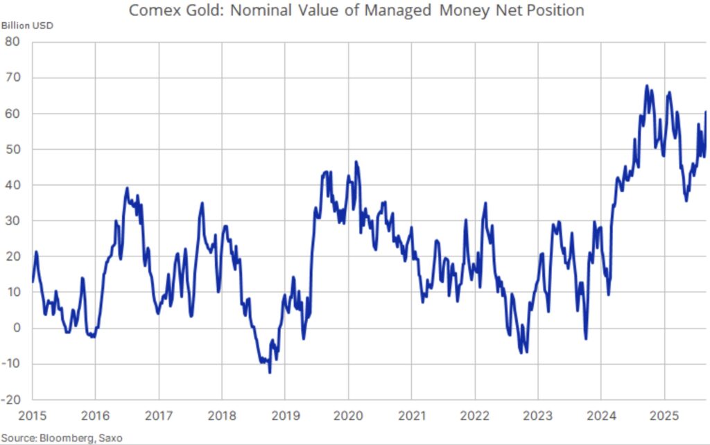 Ole Hansen, Head of Commodity Strategy: As highlighted in our weekly COT update, managed money held a net long of 169k COMEX gold futures contracts on 2 September, valued at $60.6 billion. This accounted for 47% of the total net long across 27 major futures contracts, though still below last September’s 255k contracts worth nearly $68 billion at $2,658/oz. In effect, hedge funds now gain or lose around $600 million for every 1% move in the gold price.