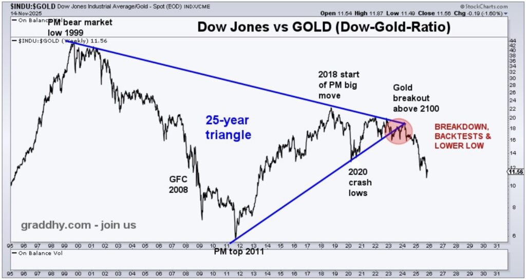 And, note that the Dow-to-Gold-ratio backtested the blue 25 year apex from below, while gold made its mega breakout above $2100 level (which I shared in real-time).