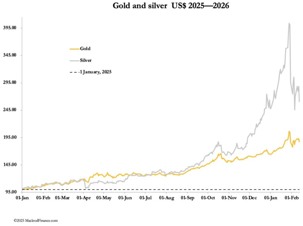 Following a solid recovery from recent unprecedented falls in gold and silver prices, yesterday they were hit again, with silver down over 10% at one stage. Prices opened a little higher this morning. In European morning trade, gold was $4950, down $20 from last Friday’s close. And silver at $77.00 was down 85 cents on balance.