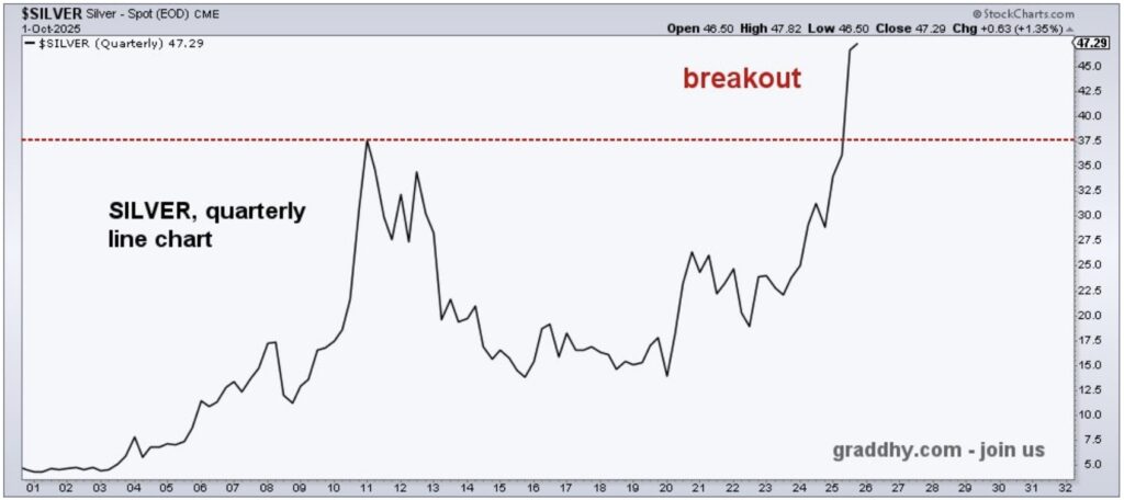 This means that silver has broken out above the 15-year previous resistance high.
