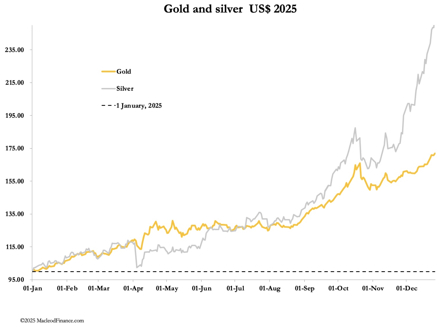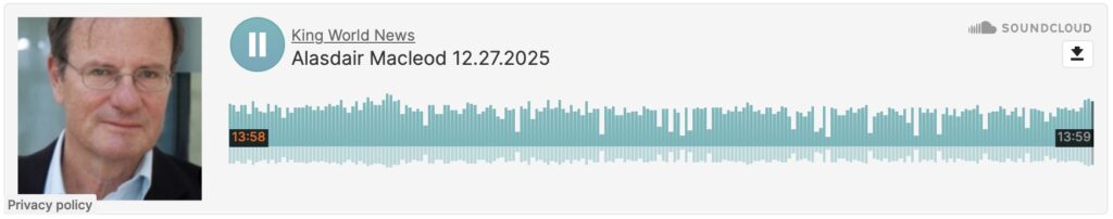 Thus, the setup for 2026 is emerging. A crisis in paper markets created by undeliverable silver as they move towards a cash basis, and at the same time accelerating moes for all commodity categories and wholesale prices generally will be the unpleasant surprise in 2026. To continue listening to Alasdair Macleod discuss the short squeeze in the gold and silver markets CLICK HERE OR ON THE IMAGE BELOW.