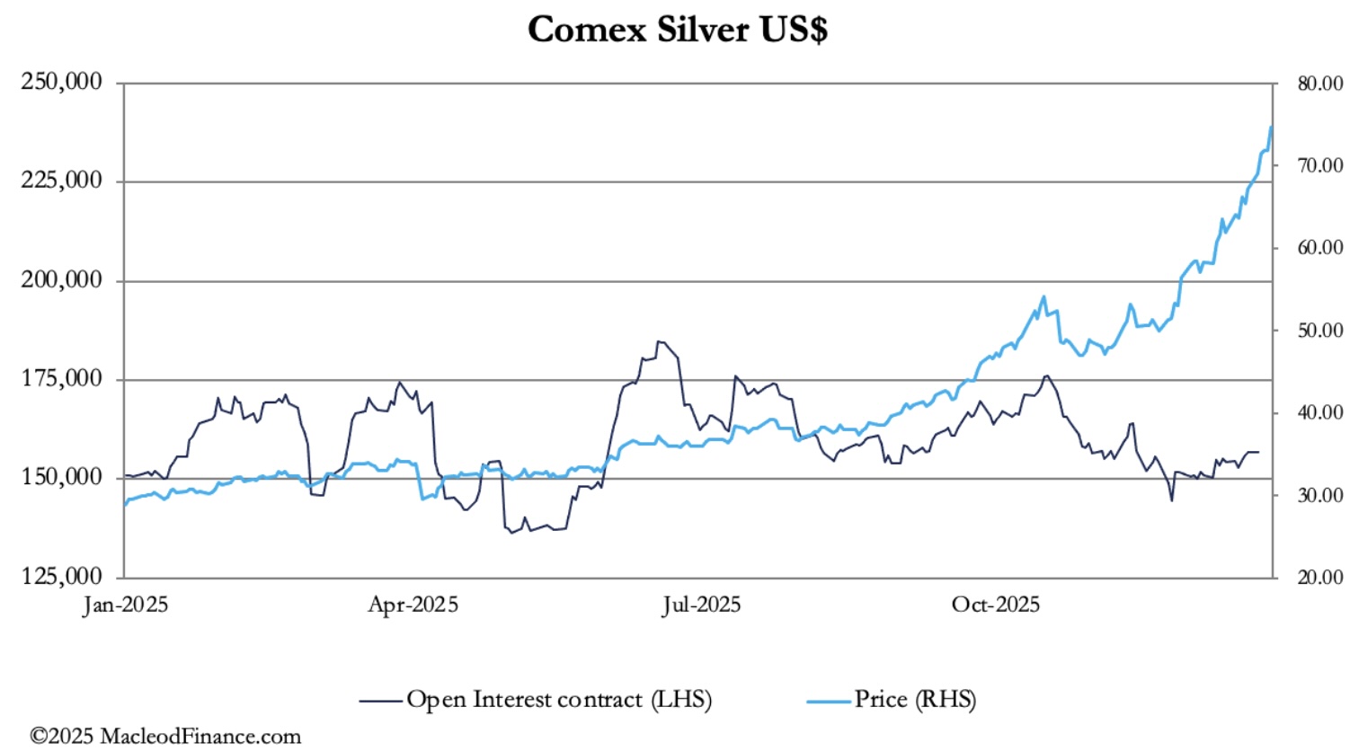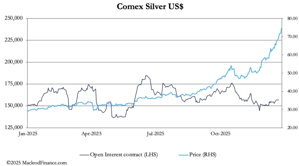 Christmas week appears to have intensified the squeeze on silver and platinum, with dramatic moves higher in Shanghai, silver even challenging the $80 level at one point last night. In European trade this morning, silver was $74.80, up $7.80 from last Friday’s close, and gold at $4518 was up $187 over the same timescale. Predictably in a holiday week with London closed yesterday and today (Boxing Day holiday), Comex volumes were light.