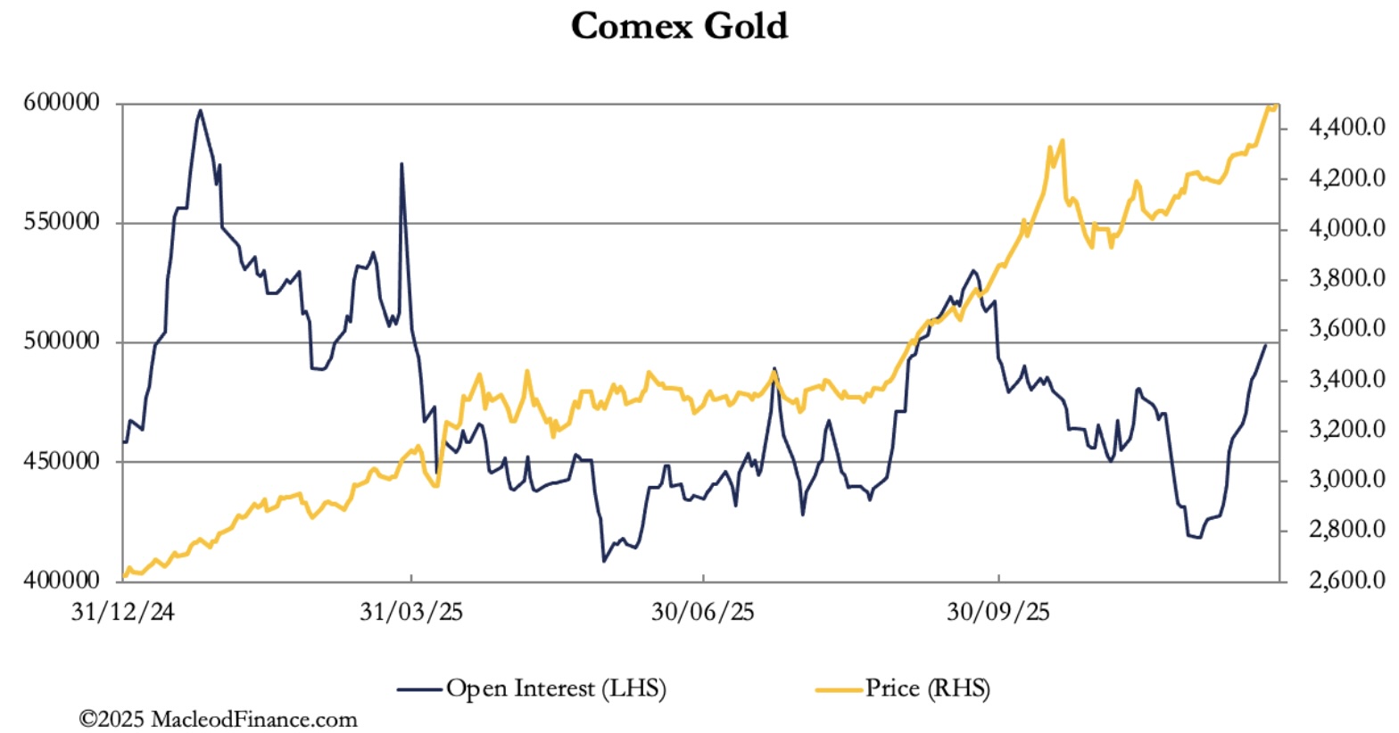 Undoubtedly, foreign central banks see this as vindication for doing away with the dollar and will not pause in their acquisition of gold both as reserves and for wealth funds. And this is before we even talk of investor and speculator demand when the consequences of monetary policies become more widely understood by domestic investors. The Comex numbers indicate that open interest is beginning to pick up and will have further to go. This is evident in the chart below: