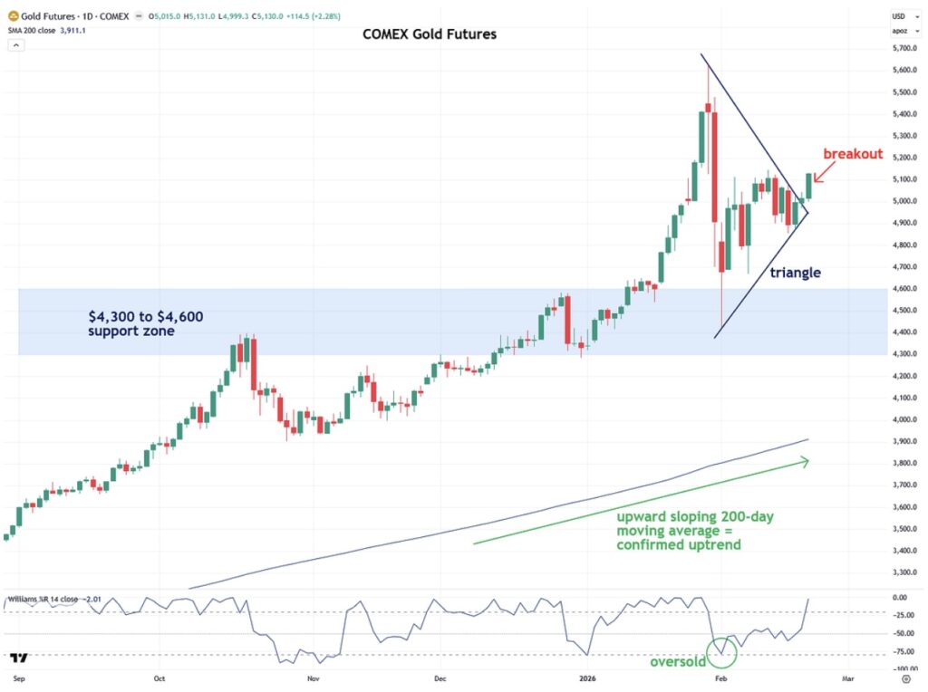 Interestingly, the sharp correction and subsequent consolidation in gold over the past month formed a triangle pattern, and today [Friday] gold broke out of that triangle to the upside. This breakout increases the probability of further bullish action, and my suspicion is that gold will attempt to rally to its prior peak of $5,600 fairly quickly.
