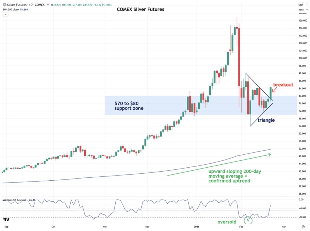 Today’s nearly 8% surge pushed silver firmly above its $70 to $80 support zone, which is a very positive development.